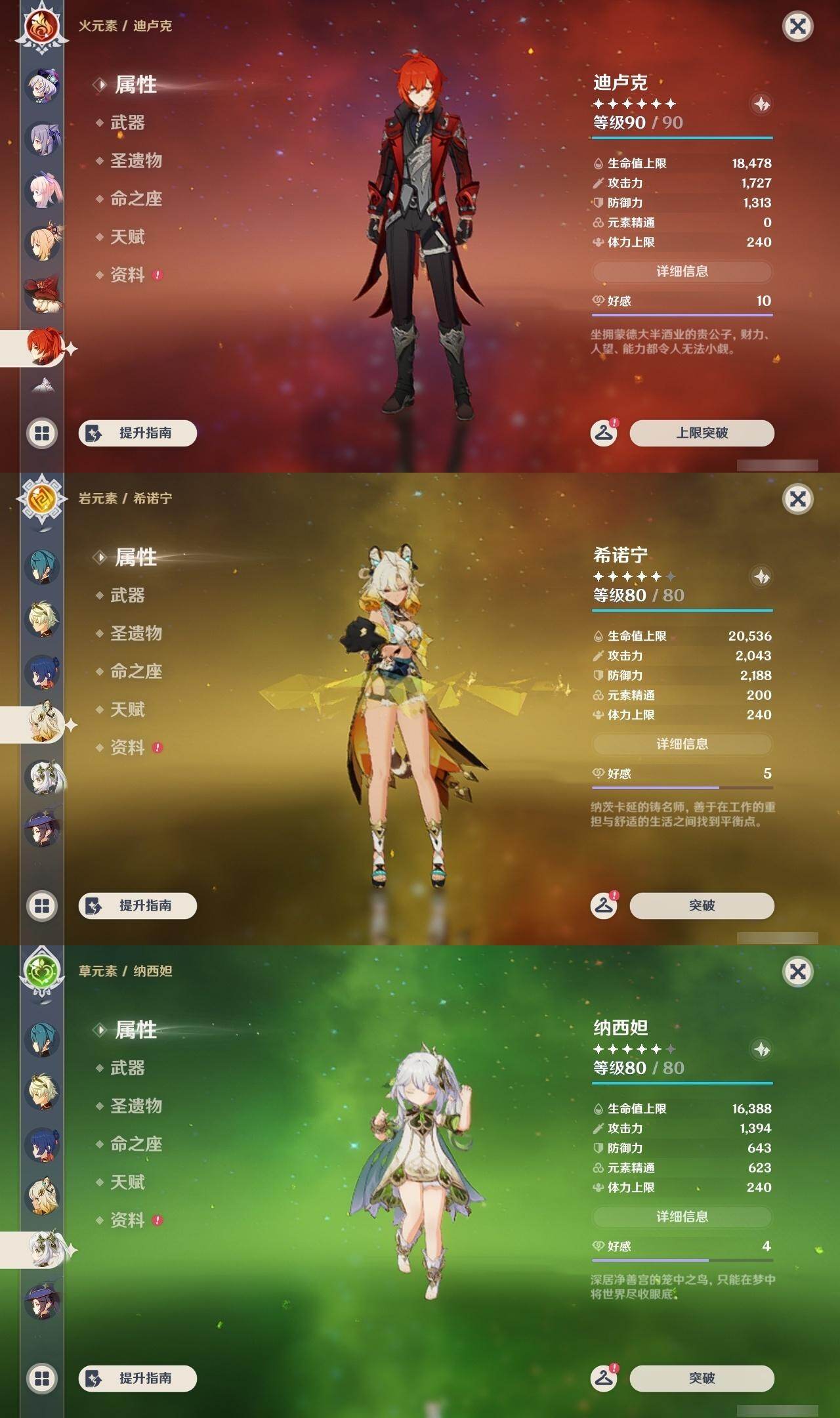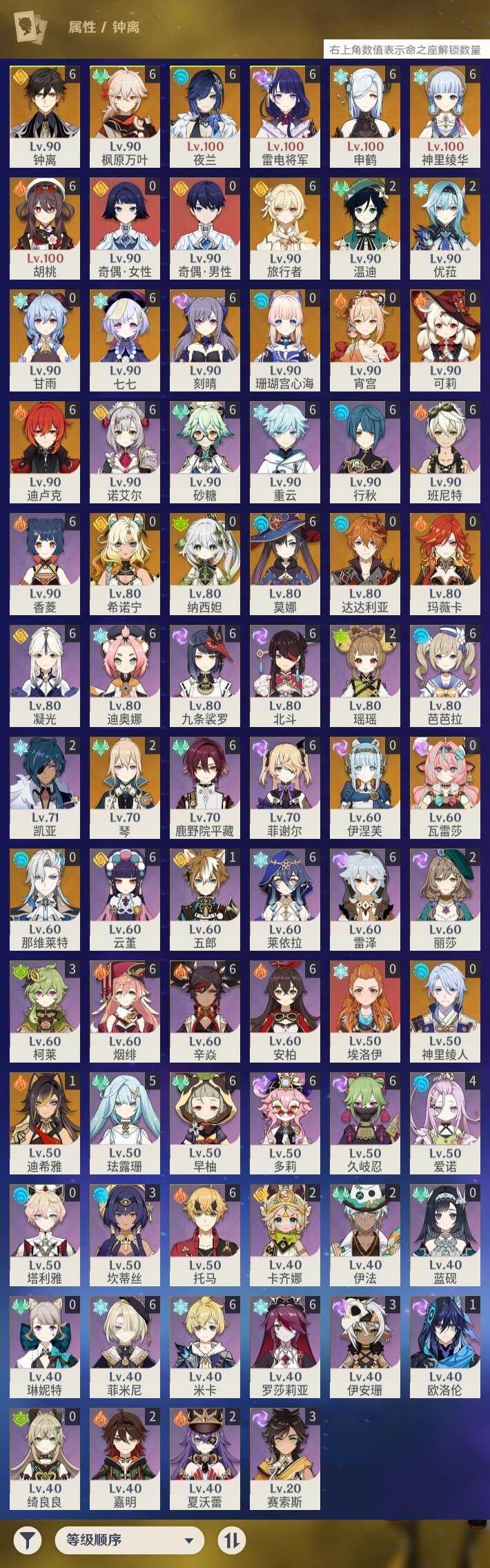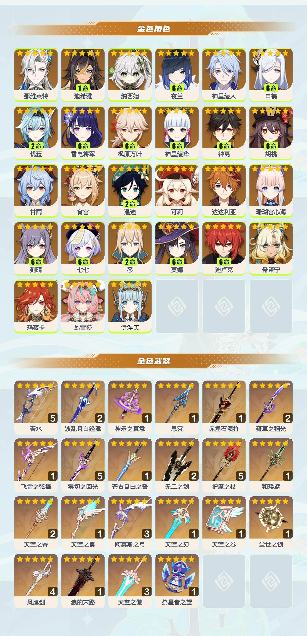 0命那维莱特,1命迪希雅,0命纳西妲,满命夜兰,0命神里绫人,满命申鹤,2命优菈,满命雷电将军,满命枫原万叶,满命神里绫华,满命钟离,满命胡桃,0命甘雨,0命宵宫,2命温迪,0命可莉,0命达达利亚,0命珊瑚宫心海,满命刻晴,满命七七,2命琴,满命莫娜,满命迪卢克,0命希诺宁,0命玛薇卡,0命瓦雷莎,0命伊涅芙