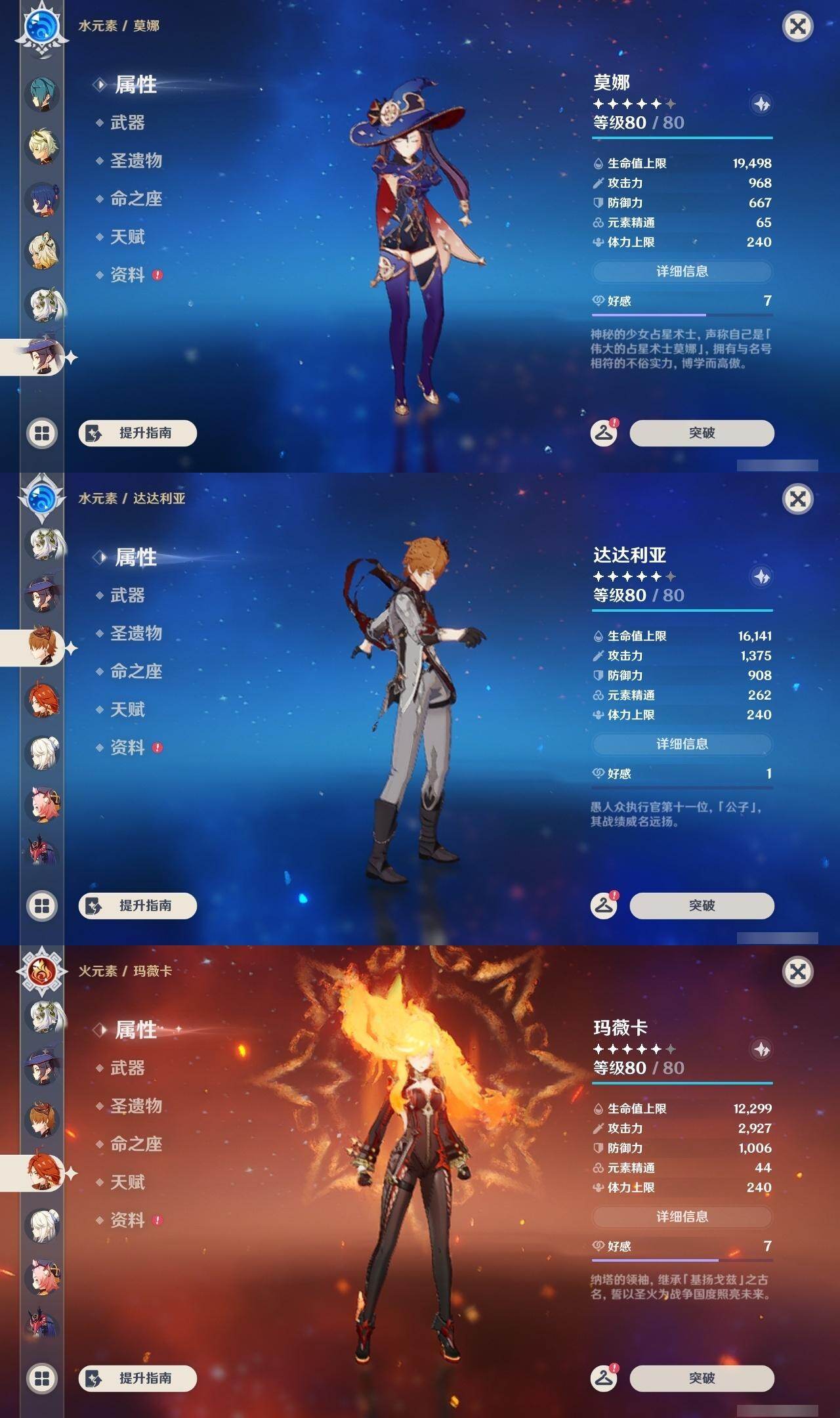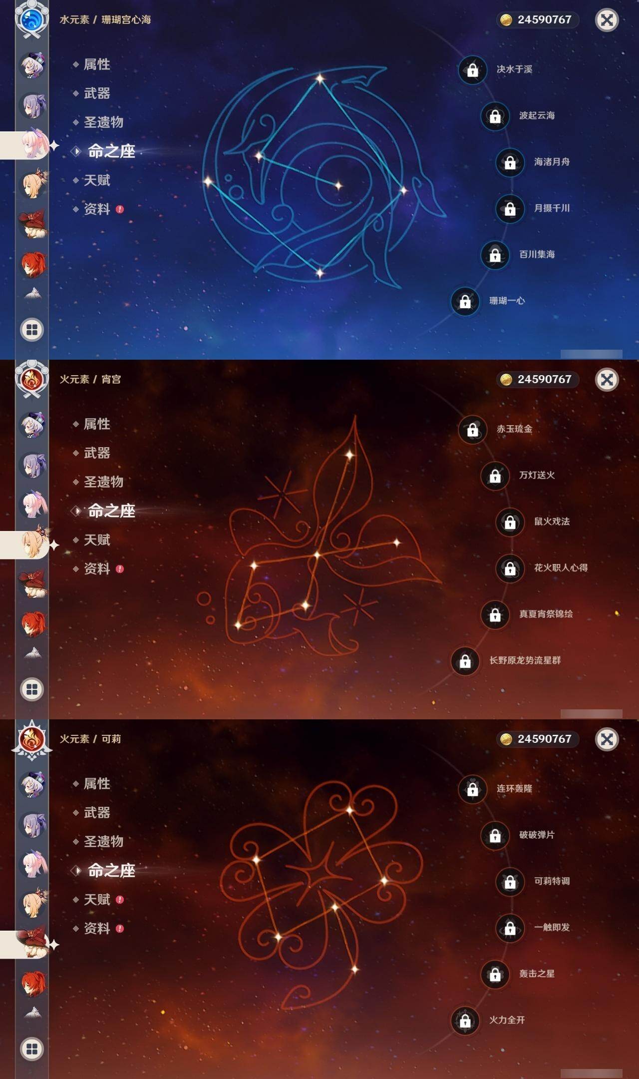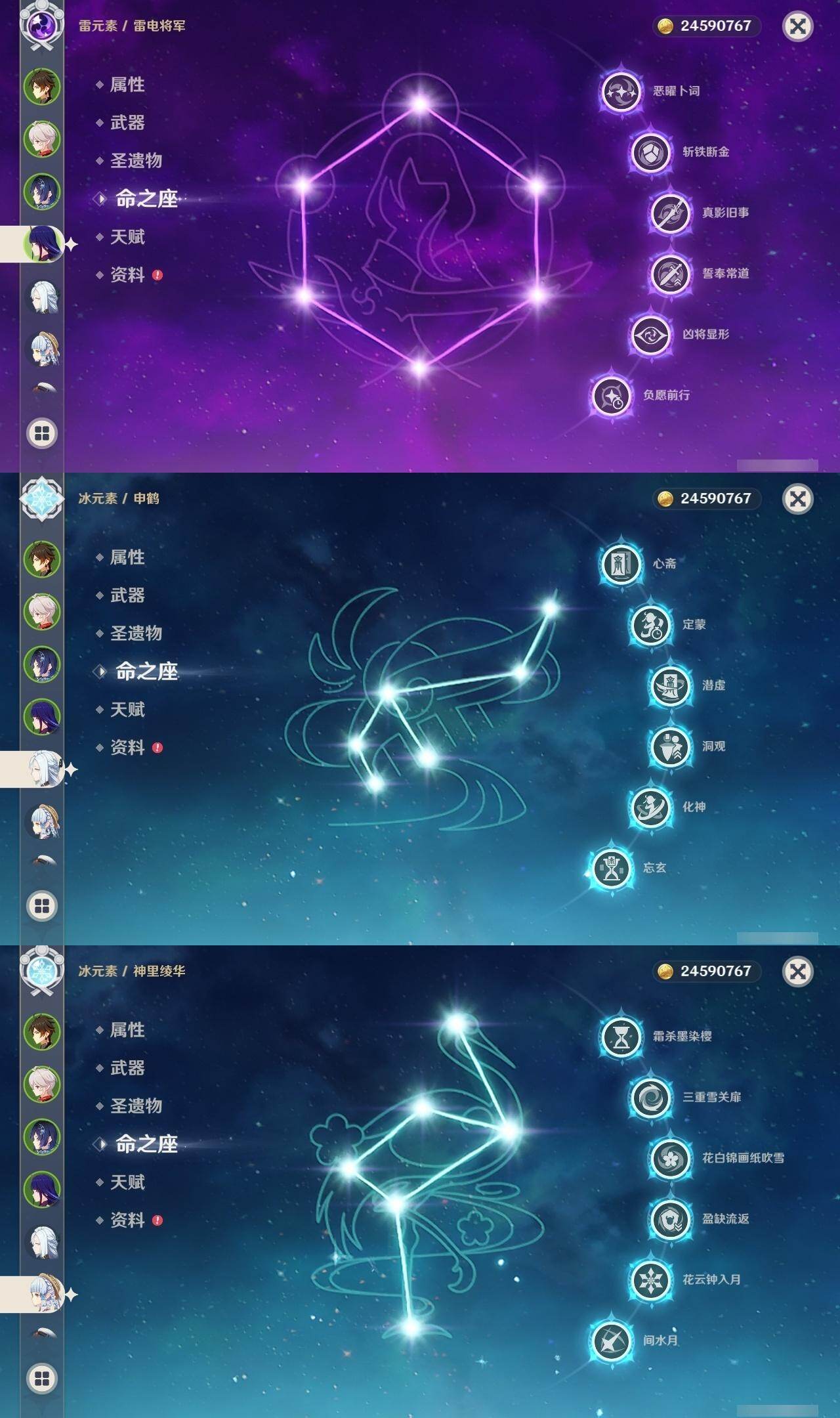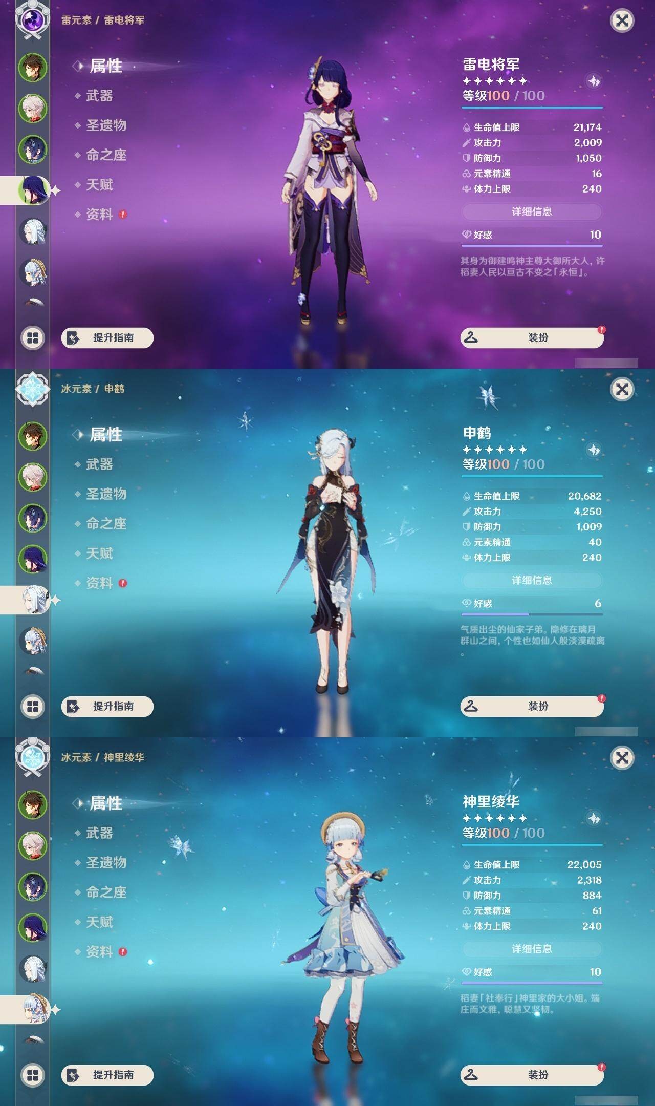 0命那维莱特,1命迪希雅,0命纳西妲,满命夜兰,0命神里绫人,满命申鹤,2命优菈,满命雷电将军,满命枫原万叶,满命神里绫华,满命钟离,满命胡桃,0命甘雨,0命宵宫,2命温迪,0命可莉,0命达达利亚,0命珊瑚宫心海,满命刻晴,满命七七,2命琴,满命莫娜,满命迪卢克,0命希诺宁,0命玛薇卡,0命瓦雷莎,0命伊涅芙