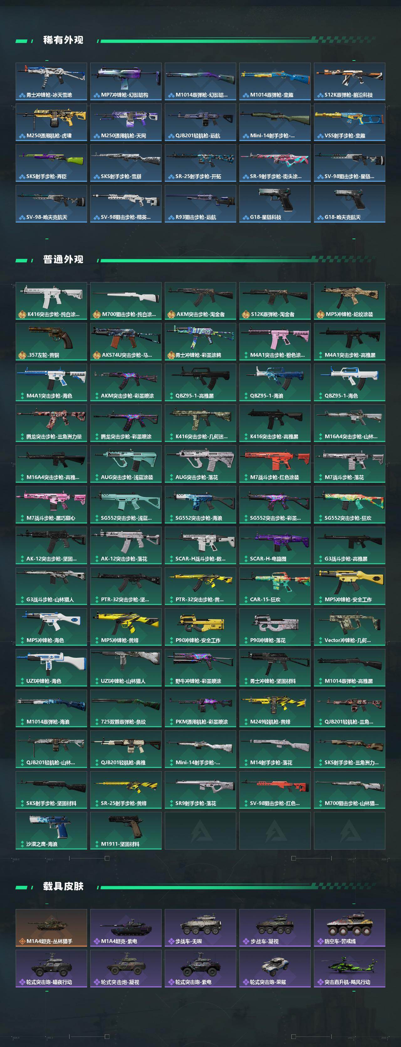 【传说外观】:M4A1突击步枪-蚀金玫瑰,M4A1突击步枪-阿米娅,AUG突击步枪-悠然茶歇,AK-12突击步枪-夜鹰,AK-12突击步枪-特斯拉线圈,SCAR-H战斗步枪-启航,CAR-15突击步枪-阿米