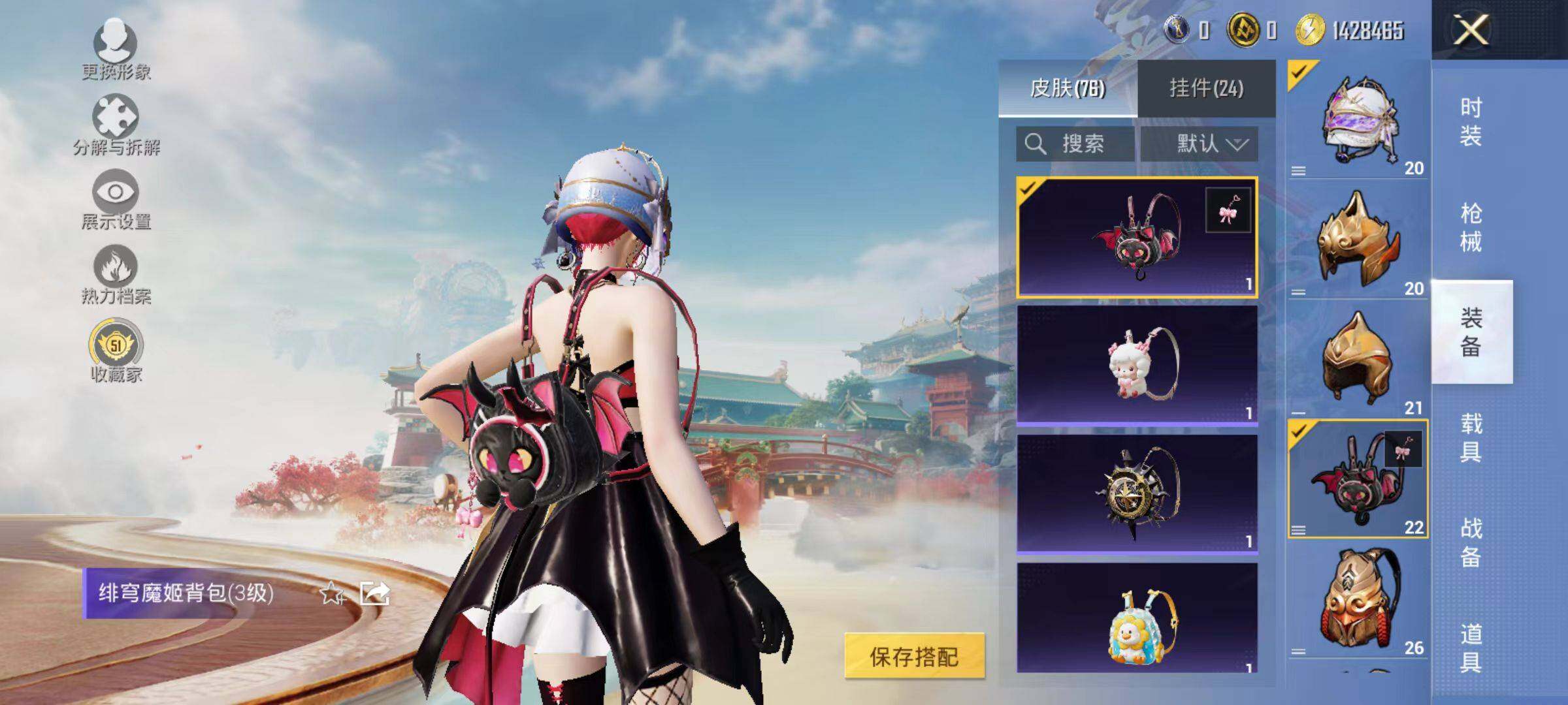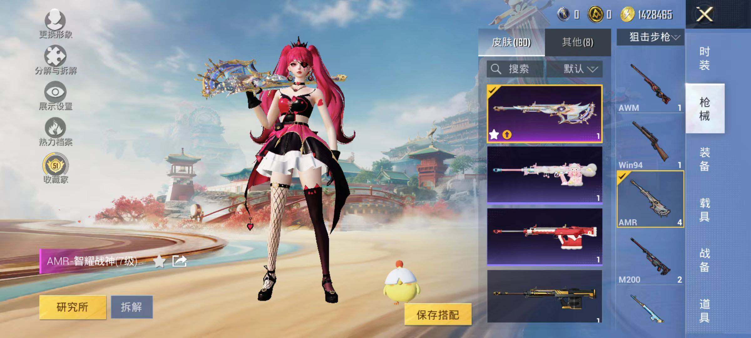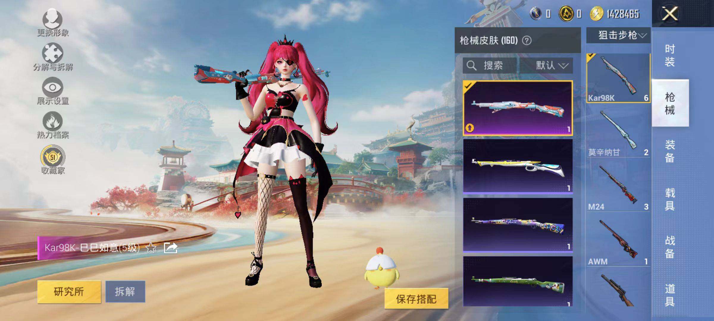 142套装/枪械3/装备161/战备126/王牌印记13/热力值48241/五级Kar98K-巳巳如意/七级AMR-智耀战神/五级DP-28-豹影疾电/粉装-繁龙极客/奇异狩猎者/金羽特工/忍者信条/套装-龟仙人/繁龙极客/角色-时光之誓/角色-绯穹魔姬/Kar98K-巳巳如意/AMR-智耀战神/DP-28-豹影疾电/星夜魔法师飞行翼/繁龙极客飞行器/时光之誓飞行器/霓虹漫游降落伞/智耀战神降落