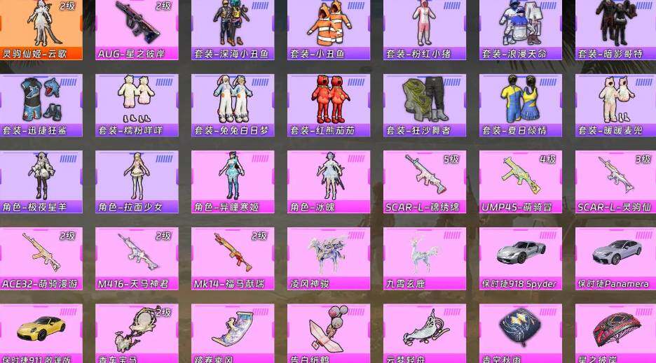 1神装2粉装7特效枪5载具4粉色飞行器80套装102枪皮【红色神装等级】:灵