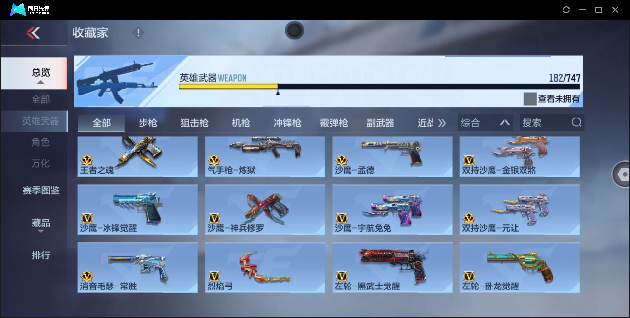 【安卓QQ】 角色等级:荣耀元首 【角色】关小雨、职场灵狐-赛事经理、葵、月神-X、英雄兰-X、幽灵刀锋-觉醒、夏日灵狐-X 【武器】王者之影、王者之心、王者之势、王者之魄、王者之怒、M12S-雷霆王者、王者之魂、王者之刺、王者之锋、王者之啸、AK47-常胜、AK47-孟德、M4A1-星象、M4A1-仲达、M4A1-威侯、KSG-孟获、加特林-炼狱、SCAR-文远、消音毛瑟-常胜、沙鹰-孟德、气手枪-炼狱、虎头湛金枪、丈八蛇矛、龙胆亮银枪、铁锹-孟德、M200-幻神、AWM-天龙、巴雷特-雷神、
