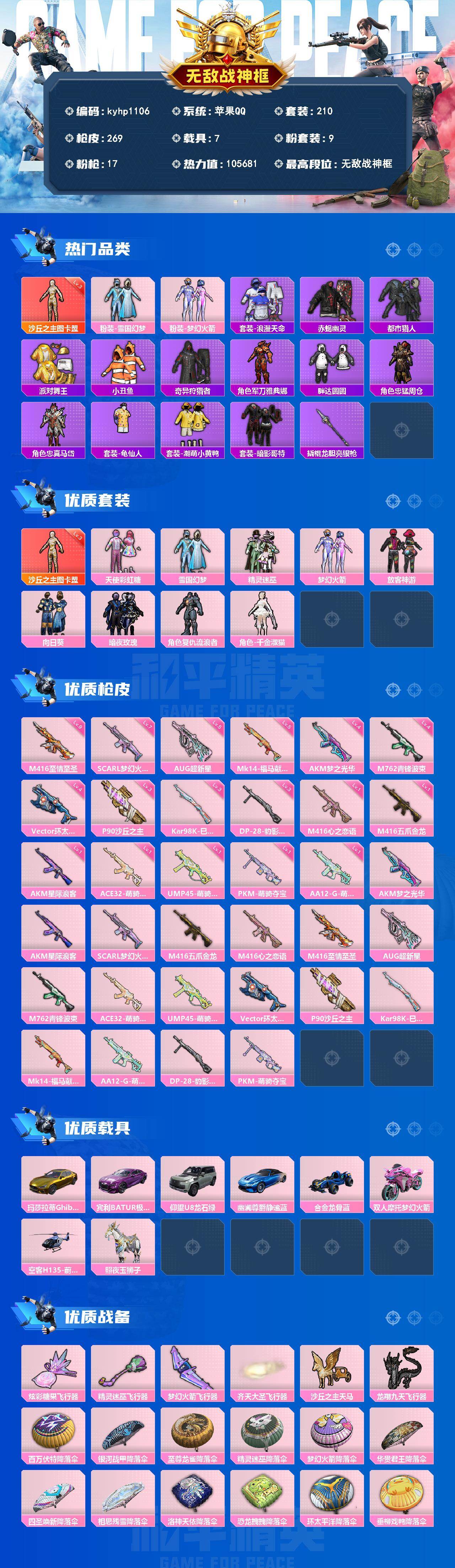 苹果 手Q-无敌战神框-1神装-9粉装-17特效枪-7载具-6粉色飞行器-105681热力值-11王牌印记-210套装-269枪皮