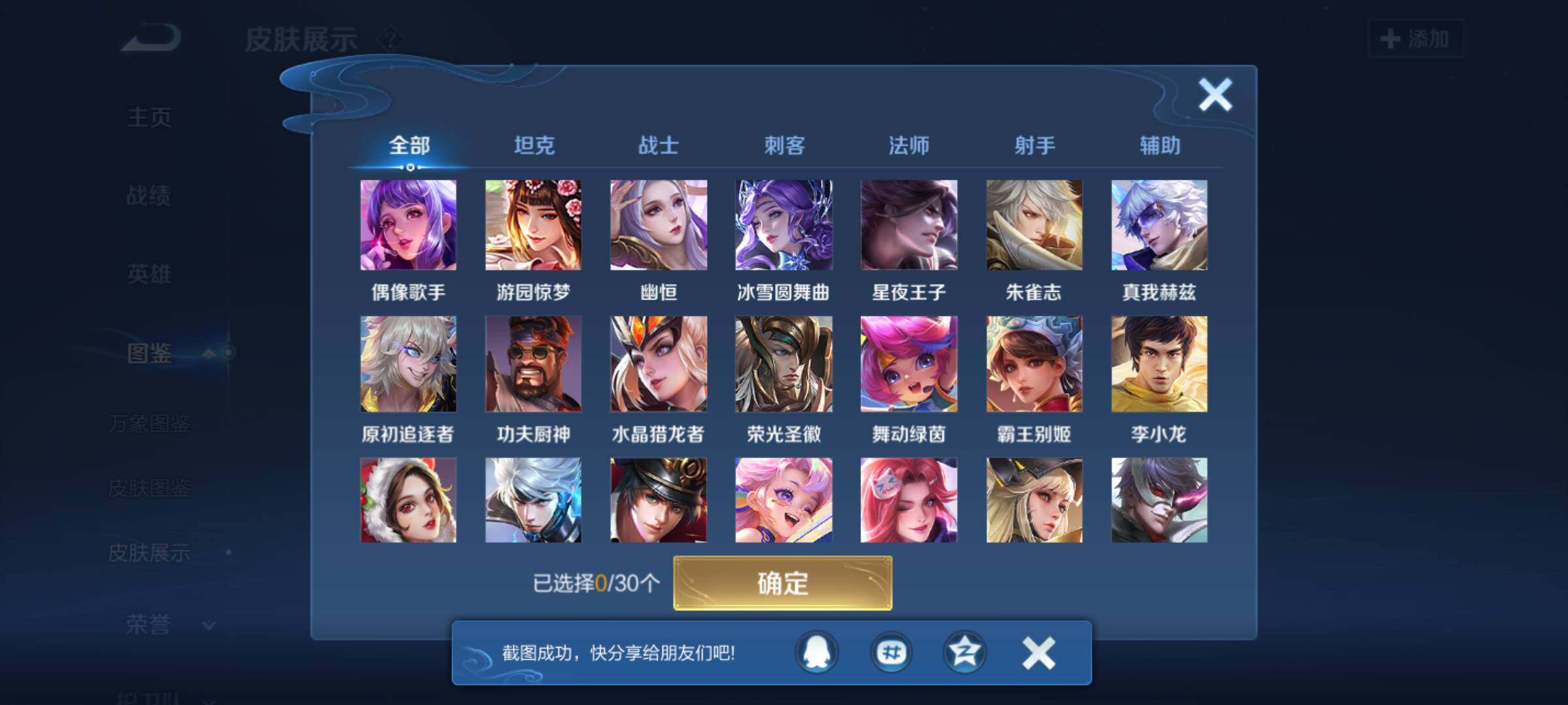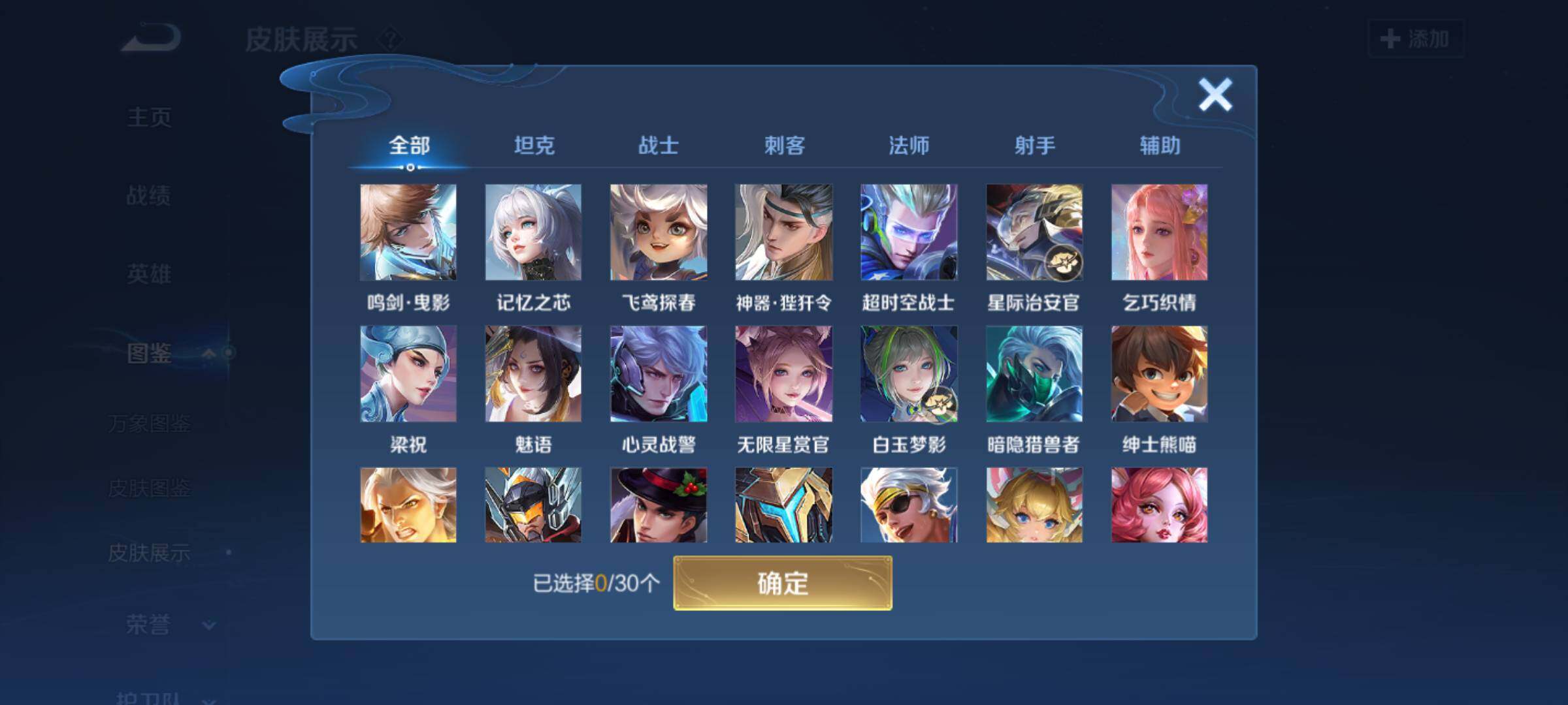 【限定皮肤】:白起狰,姜子牙天穹之誓,狄仁杰阴阳师,虞姬凯尔特女王,赵云皇家上将,妲己时之彼端,嬴政优雅恋人,孙尚香蔷薇恋人,庄周高山流水,高渐离死亡摇滚,芈月重明,夏侯惇朔风刀,甄姬幽恒,甄姬游园惊梦,曹操烛龙,典韦穷奇,马可波罗暗影游猎,狄仁杰魔术师,狄仁杰万华元夜,狄仁杰神器狴犴