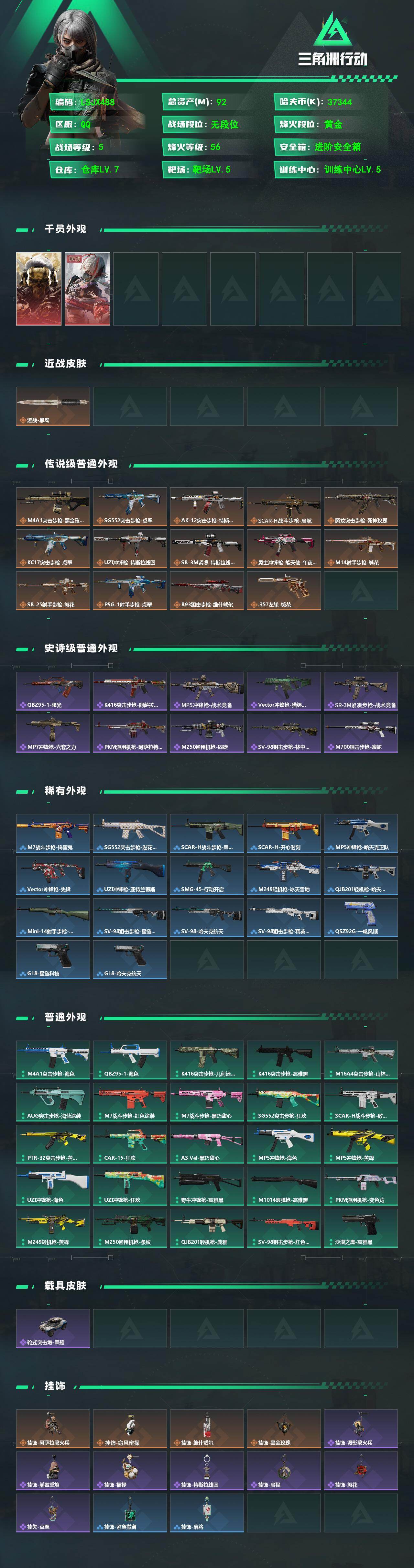 【特价出售/店主推荐】92m总资产-37344k哈夫币-56烽火等级-黄金-5战场等级-无军衔【干员外观】:红狼-蚀金玫瑰,骇爪-维什戴尔【近战皮肤】:近战-黑鹰【传说外观】:M4A1突击步枪-蚀金玫瑰,SG552突击步枪-点翠,AK-12突击步枪-特斯拉线圈,SCAR-H战斗步枪-启航,腾龙突击步枪-死神玫瑰,KC17突击步枪-点翠,UZI冲锋枪-特斯拉线圈,SR-3M紧凑突击步枪-特斯拉线圈,勇士冲锋枪-能天使-午夜邮差,M14射手步枪-缄花,SR-25射手步枪-缄花,PSG-1射手步枪-点