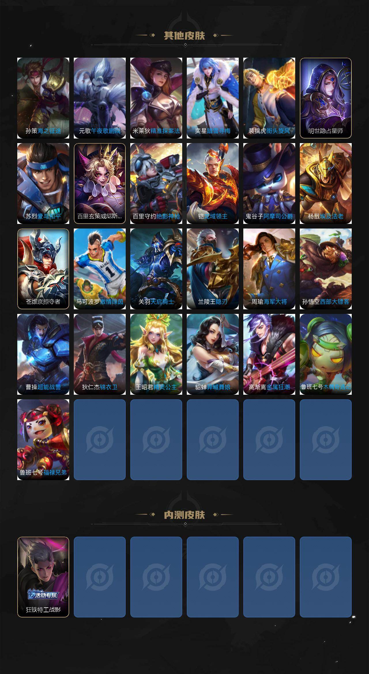【传说皮肤】:司空震愿照山河定,澜愿照九州拓,云缨幻光神枪,桑启鸣野蒿,铠冥王哈迪斯,亚连落雪白狼,吕布曦玄引,典韦战鼓燎原,孙策乘龙淬吴钩,赵云乘龙铭钟鼎,马可波罗妄想实况,干将莫邪画中仙,马超无双飞将
