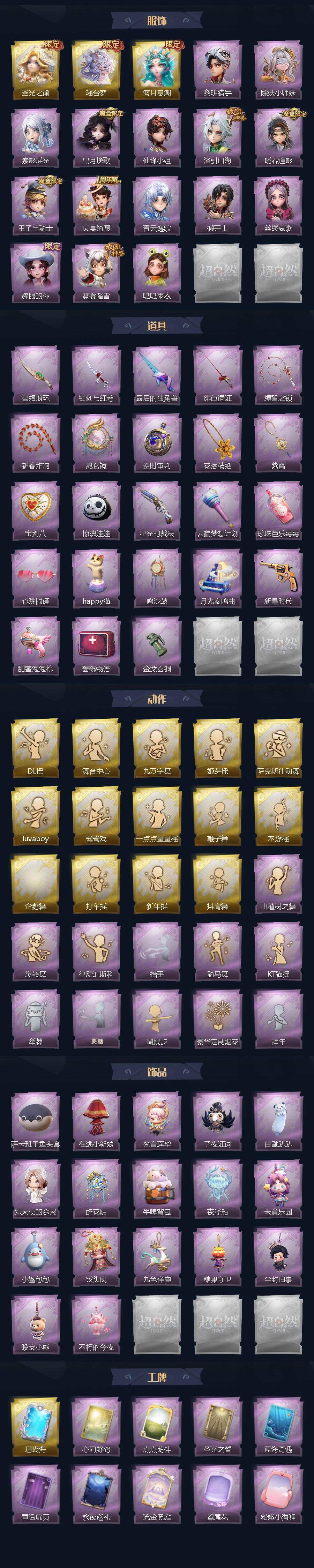 薇薇安-圣光之谕,莉莉-瑶台梦,薇薇安-海月息潮,艾伦-黎明猎手,莉莉-除妖小师妹,巫铃儿-素影瑶光,薇薇安-黑月挽歌,薇薇安-仙锋小姐,逍遥-泽引山海,逍遥-绣春逍影,阿念-王子与骑士,阿念-庆宴绮愿,零-青云逸歌,零-搬开山,爱丽丝-丝缕哀歌,爱丽丝-耀眼的你,小黄-霓裳踏雪,小黄-呱呱雨衣,刺刀-碧络琅环,刺刀-铂刺与红萼,桃木剑-最后的独角兽,桃木剑-绯色遗证,长鞭-缚誓之锁,长鞭-新春炸响,传送按钮-昆仑镜,传送按钮-逆时审判,摸金符-花落精绝,摸金符-紫霄,腰包-宝剑八,腰包-惊魂娃