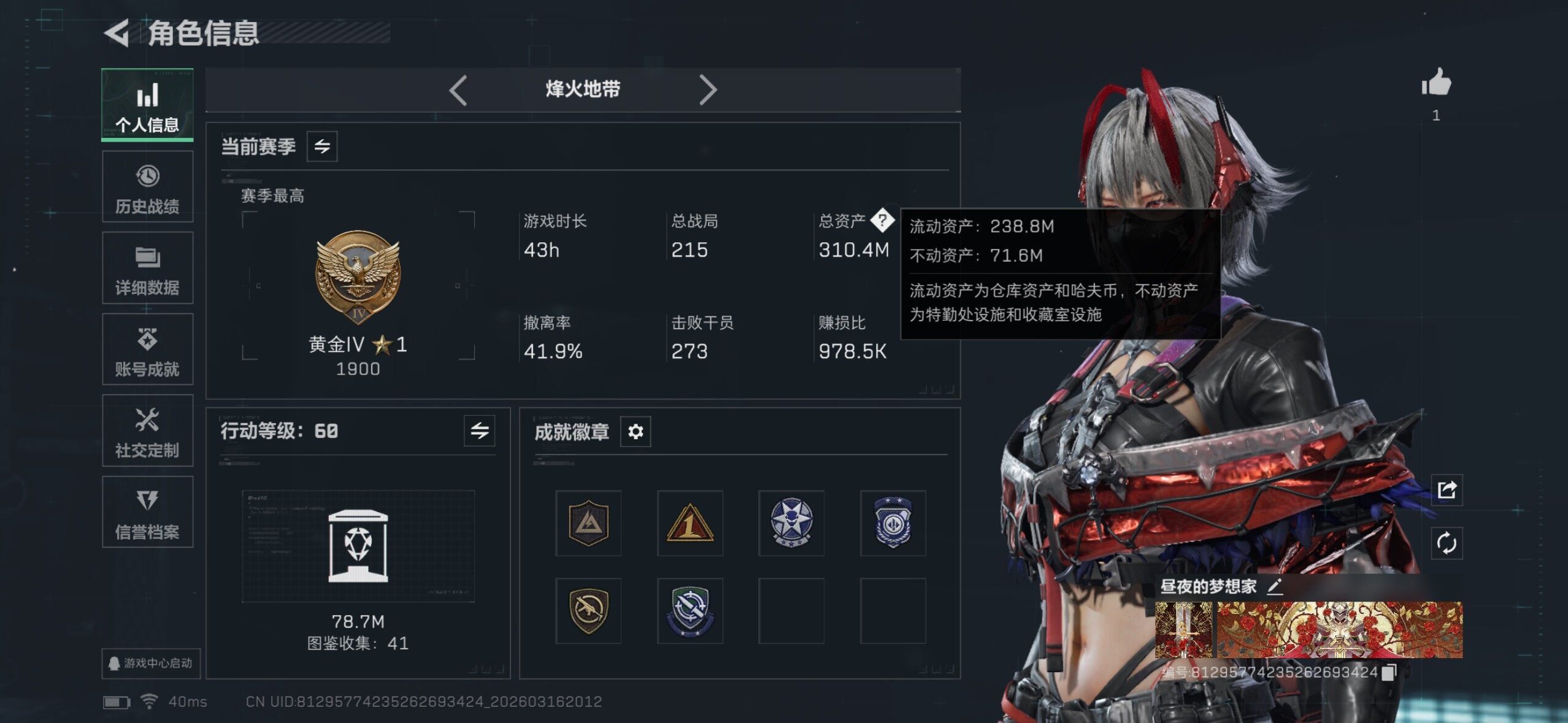 310m总资产-168751k哈伏币-60烽火等级-黄金-46战场等级-校官