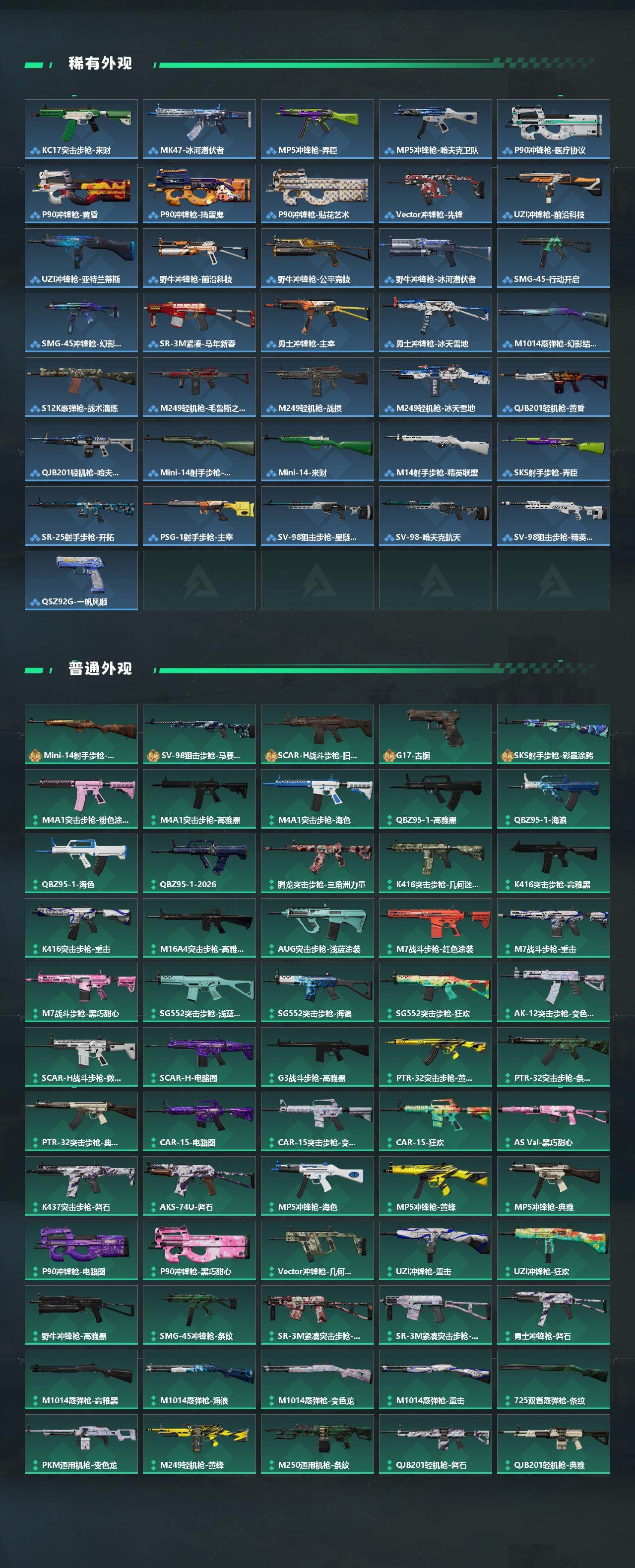【传说外观】:M4A1突击步枪-蚀金玫瑰,M4A1突击步枪-阿米娅,AKM突击步枪-锦绣,QBZ95-1突击步枪-凌霄戍卫,ASh-12战斗步枪-鹅鸭杀,AUG突击步枪-悠然茶歇,SG552突击步枪-运