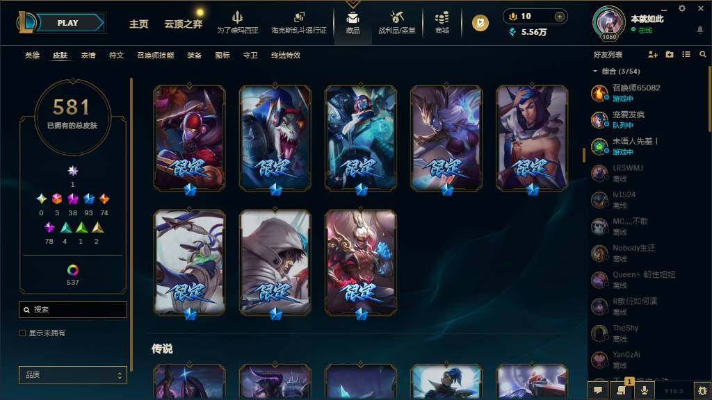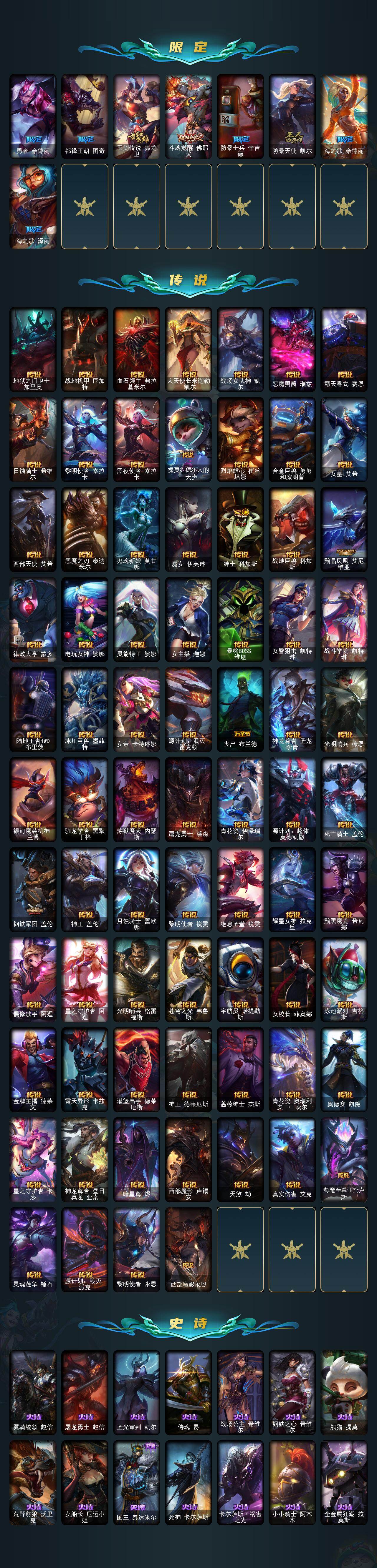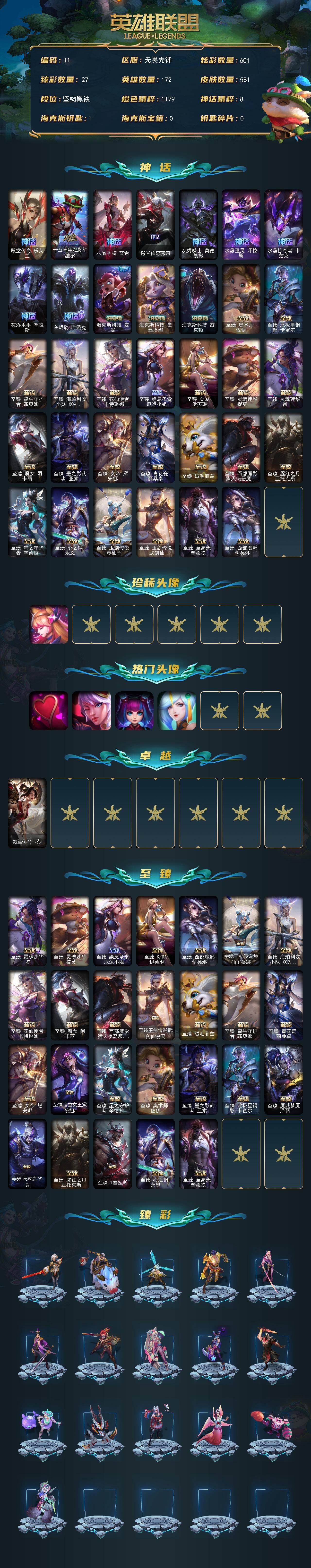 未定级段位-172英雄-581皮肤-601炫彩-3终极-38神话-93限定-74传说-78史诗