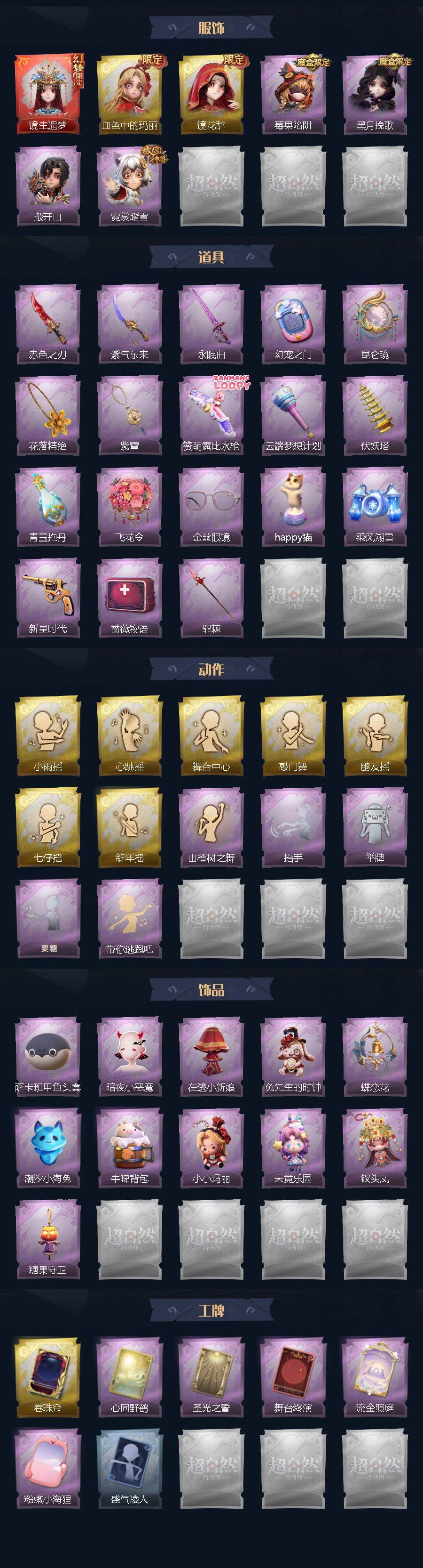 巫铃儿-镜生遗梦,爱丽丝-血色中的玛丽,巫铃儿-镜花辞,莉莉-莓果陷阱,薇薇安-黑月挽歌,零-搬开山,小黄-霓裳踏雪,刺刀-赤色之刃,刺刀-紫气东来,桃木剑-永眠曲,传送按钮-幻宠之门,传送按钮-昆仑镜,摸金符-花落精绝,摸金符-紫霄,短管猎枪-赞萌露比水枪,专业手电-云端梦想计划,葫芦-伏妖塔,黄牛能量饮料-青玉抱丹,额外的背包-飞花令,夜视仪-金丝眼镜,音响-happy猫,喷气背包-乘风溯雪,转轮手枪-新星时代,急救包-蔷薇物语,长枪-罪棘,小雨摇,心跳摇,舞台中心,敲门舞,鹏友摇,七仔摇,