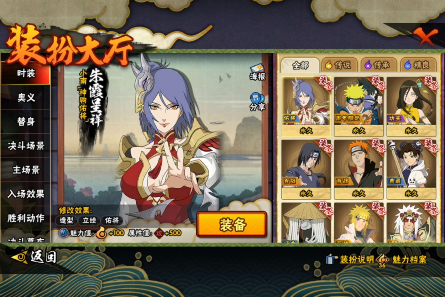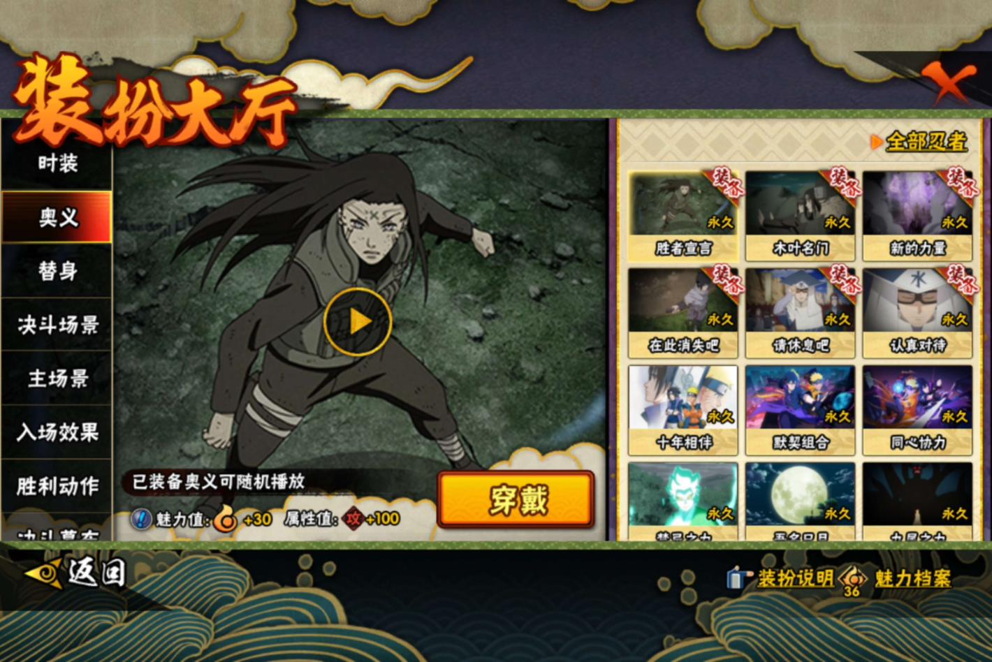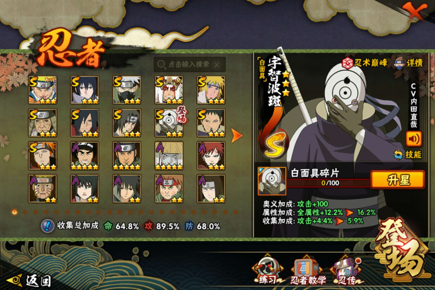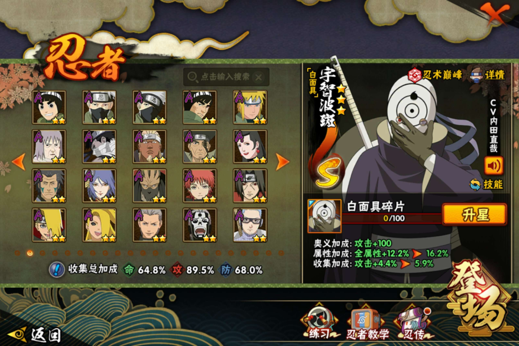 【S级忍者】宇智波带土「忍界大战」(3星),旗木卡卡西「须佐能乎」(3星),宇智波斑「秽土转生·解」(3星),宇智波佐助「永恒万花筒」(3星),宇智波斑「白面具」(3星),自来也「舞之豪杰」(3星),宇智波鼬「须佐能乎」(3星),漩涡鸣