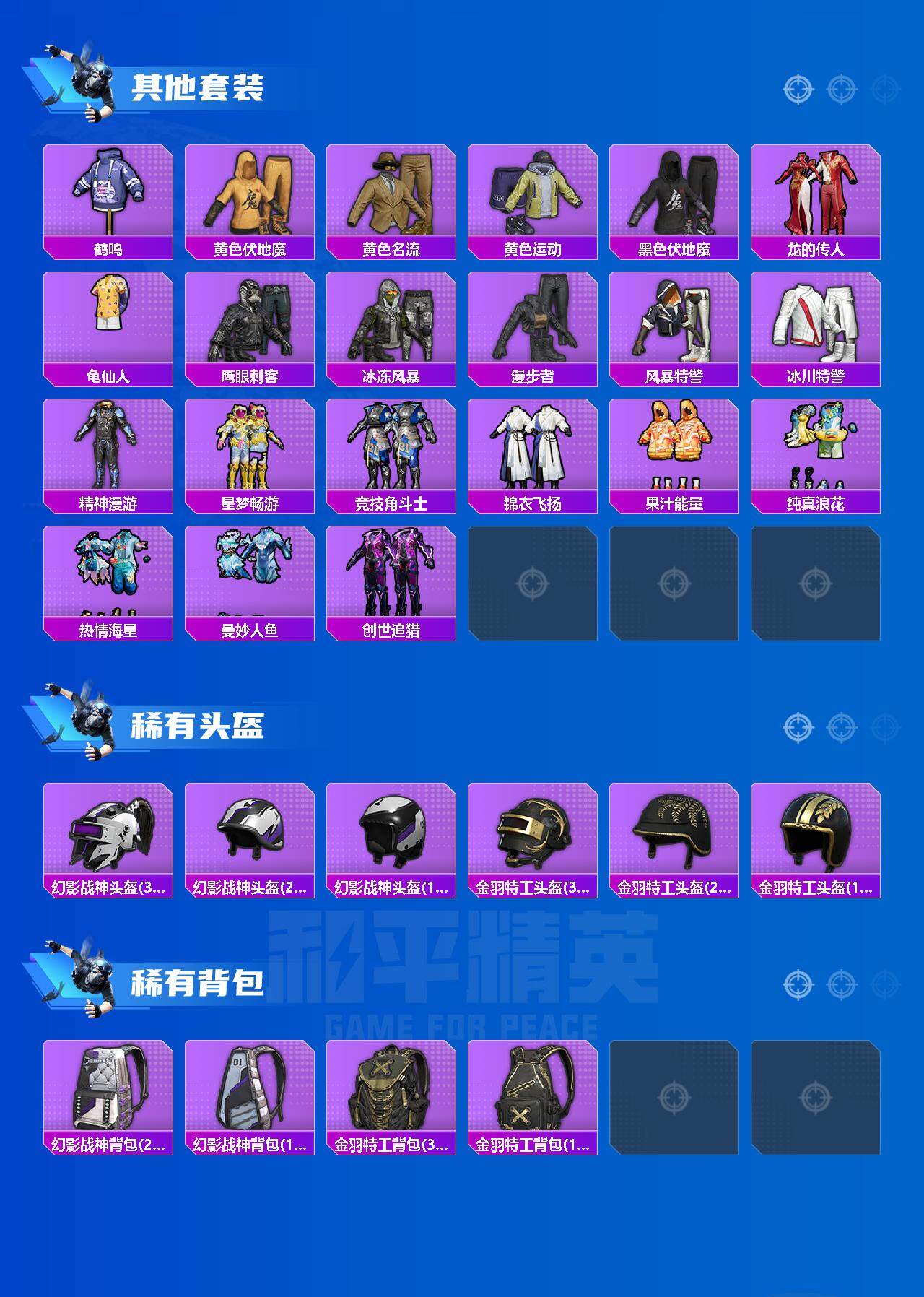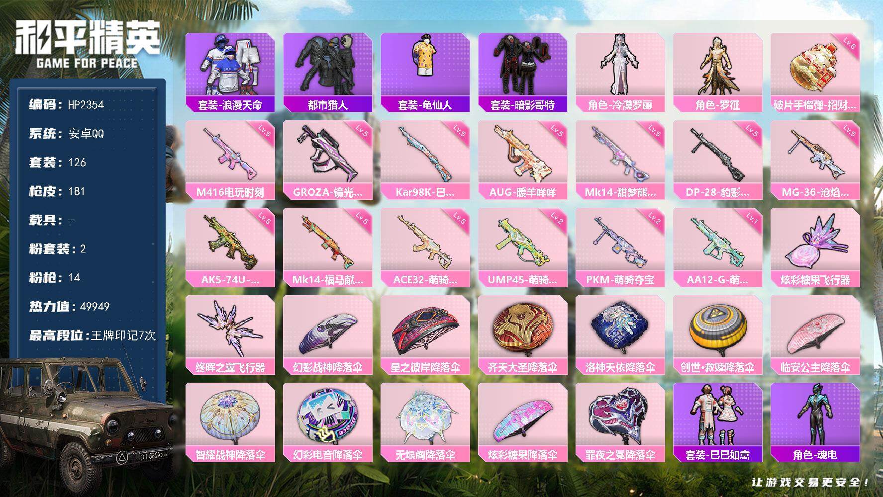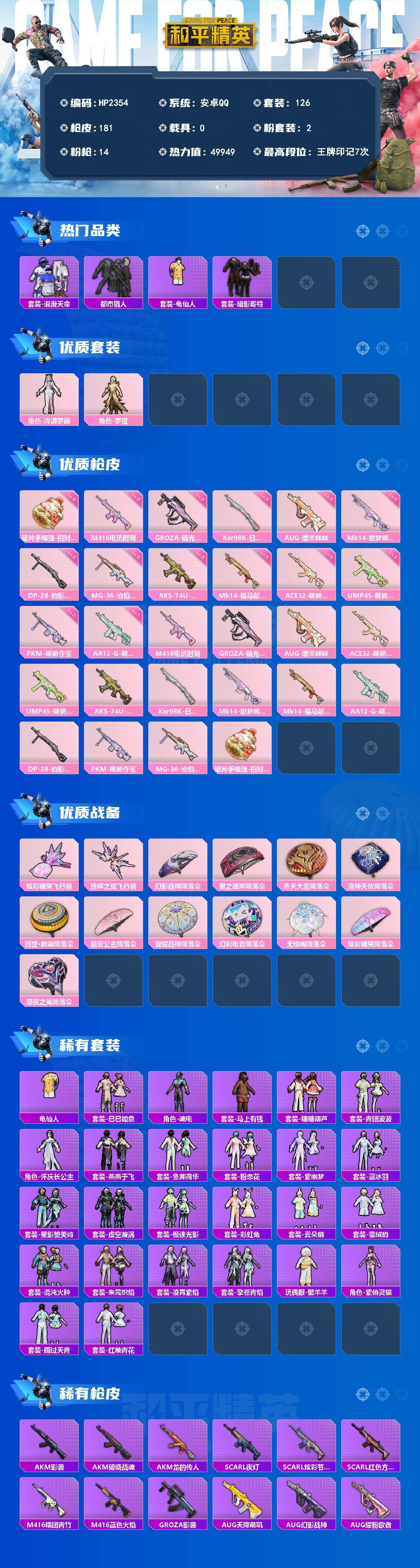 【HP2354】126套装/枪械14/装备205/战备131/王牌印记7/热力值49949/五级M416-电玩时刻/五级GROZA-镜光银凌/五级AUG-暖羊咩咩/五级ACE32-萌骑漫游/二级UMP45-萌骑冒险/五级AKS-74U-森灵之息/五级Kar98K-巳巳如意/五级Mk14-甜梦熊击/五级Mk14-福马献瑞/一级AA12-G-萌骑幻想/五级DP-28-豹影疾电/二级PKM-萌骑夺宝/五级MG-36-沧焰双生/六级破片手榴弹-招财进宝/套装-浪漫天命/套装-都市猎人/套装-龟仙人/套装