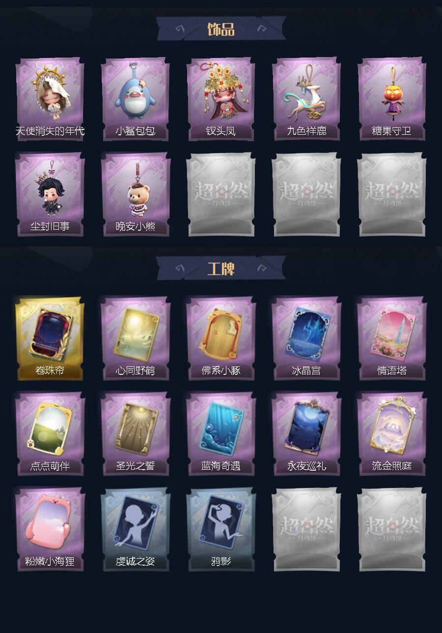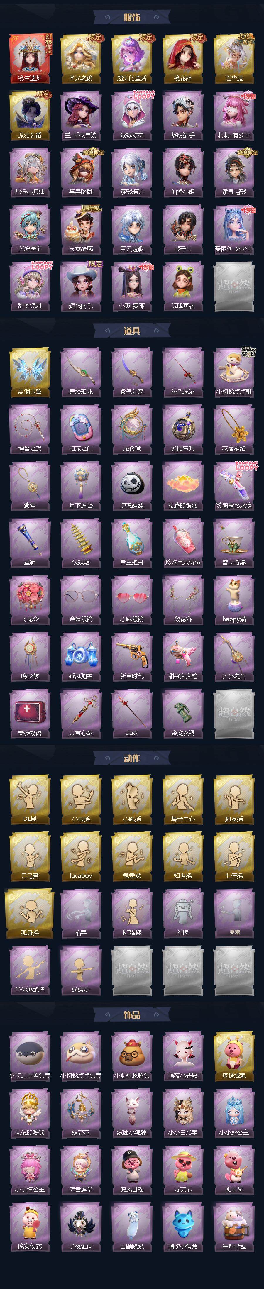 巫铃儿-镜生遗梦,薇薇安-圣光之谕,小黄-遗失的童话,巫铃儿-镜花辞,逍遥-莲华渡,零-渡鸦公爵,兰-千夜星谕,艾伦-绒绒对决,艾伦-黎明猎手,莉莉-情公主,莉莉-除妖小师妹,莉莉-莓果陷阱,巫铃儿-素影瑶光,薇薇安-仙锋小姐,逍遥-绣春逍影,阿念-迷途僵宝,阿念-庆宴绮愿,零-青云逸歌,零-搬开山,爱丽丝-冰公主,爱丽丝-甜梦派对,爱丽丝-耀眼的你,小黄-罗丽,小黄-呱呱雨衣,喷气背包-晶澜灵翼,刺刀-碧络琅环,刺刀-紫气东来,桃木剑-绯色遗证,长鞭-小狗蛇点点鞭,长鞭-缚誓之锁,传送按钮-幻