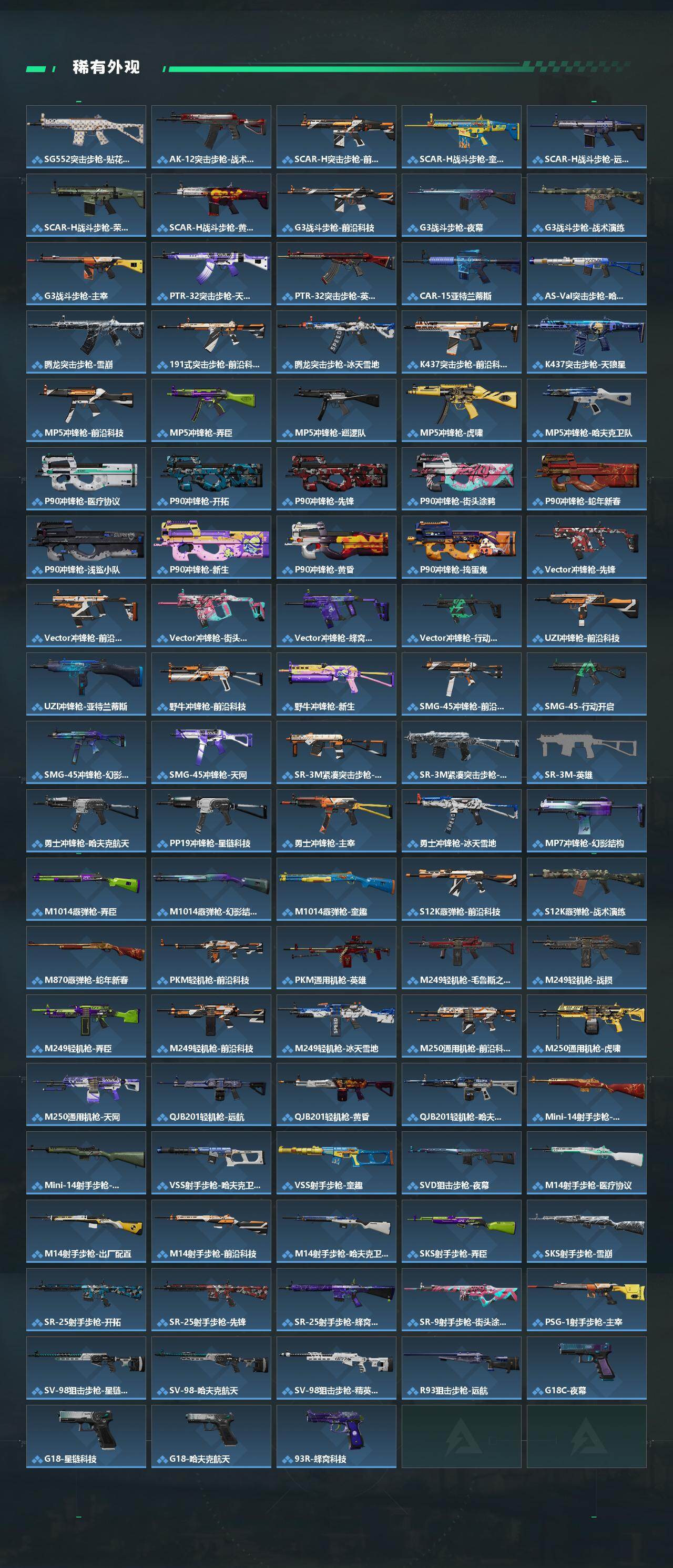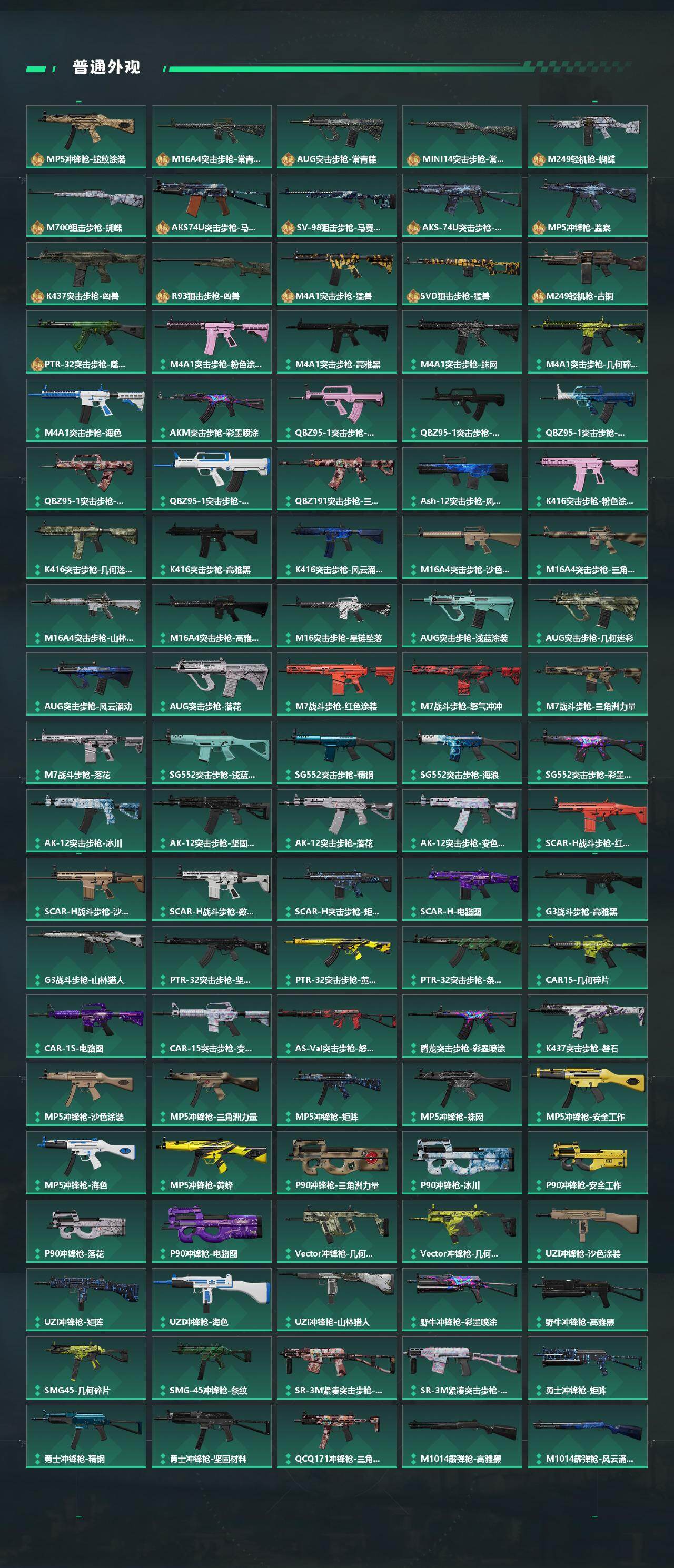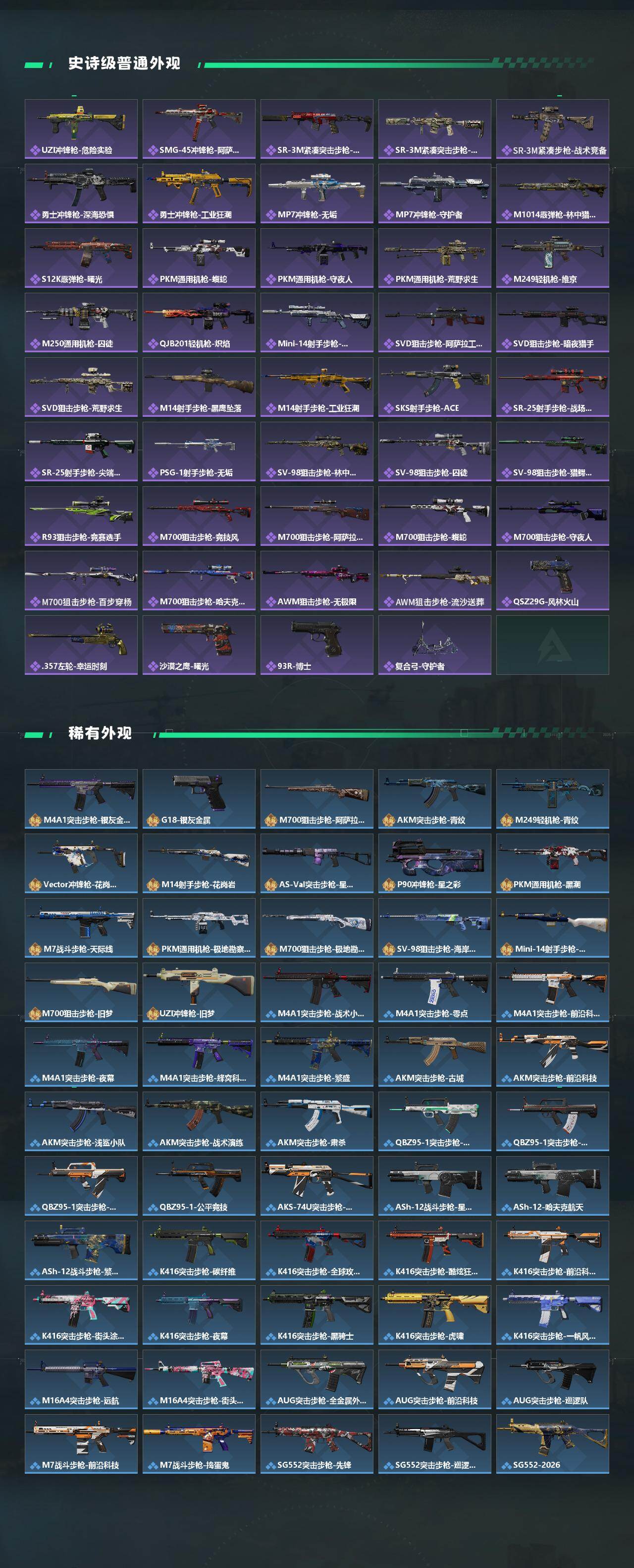 【传说外观】:M4A1突击步枪-蚀金玫瑰,M4A1突击步枪-阿米娅,AKM突击步枪-赤枭,QBZ95-1突击步枪-破军,M16A4突击步枪-狩猎时刻,M
