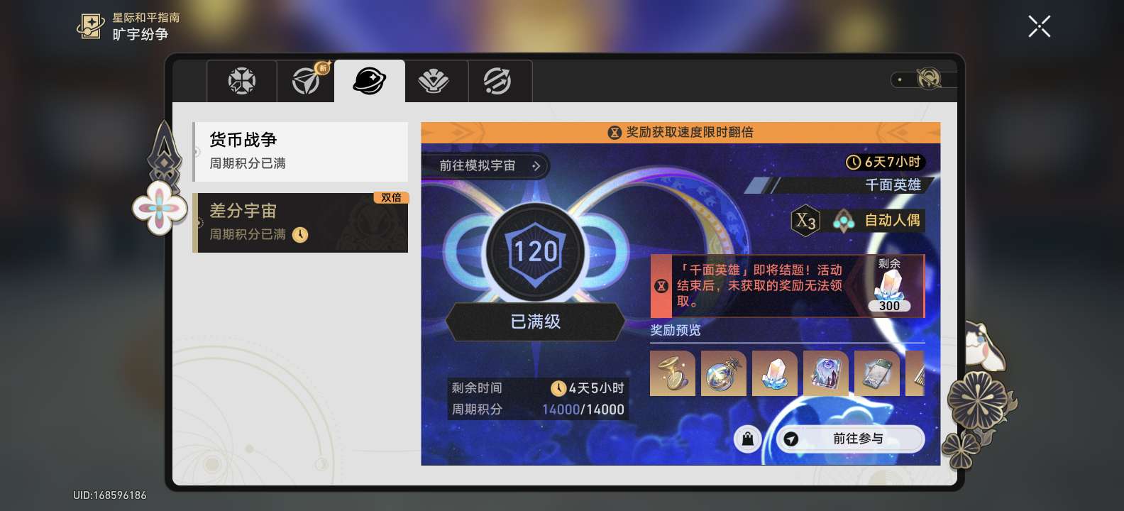 10w星琼,蓝色任务/常驻活动没做,模拟宇宙DLC打了一些,货币战争47级,后四个宇宙地图没动