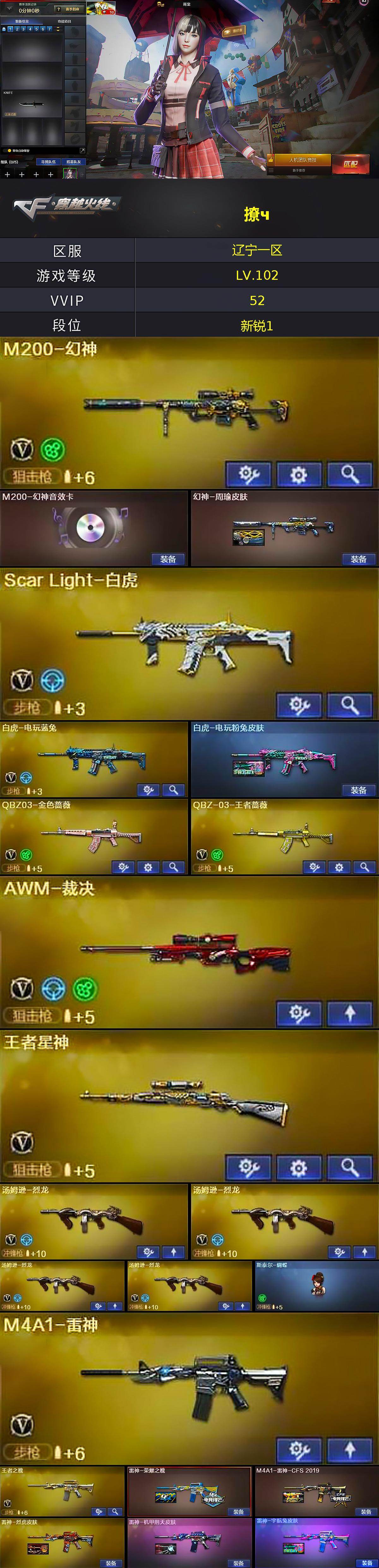 幻神三件套,辽宁一区-57V-11王者武器数-1炫金武器数【热门武器】:QBZ03-金色蔷薇,Scar Light-白虎,M200-幻神,白虎-电玩蓝兔,M4A1-黑骑士,汤姆逊-烈龙*4,斯泰尔-蝴蝶,沙鹰-修罗【王者炫金武器】:炫金修罗,王者之魄高爆手雷,王者之魄闪光弹*4,王者之魄烟雾弹【音效卡】:M200-幻神音效卡,M4A1-黑骑士音效卡,Barrett-碧霄极光音效卡,AWM-昌龙-怀旧音效卡【皮肤】:幻神-周瑜皮肤,白虎-电玩粉兔皮肤,雷神-荣耀之魄,M4A1-雷神-CFS 201