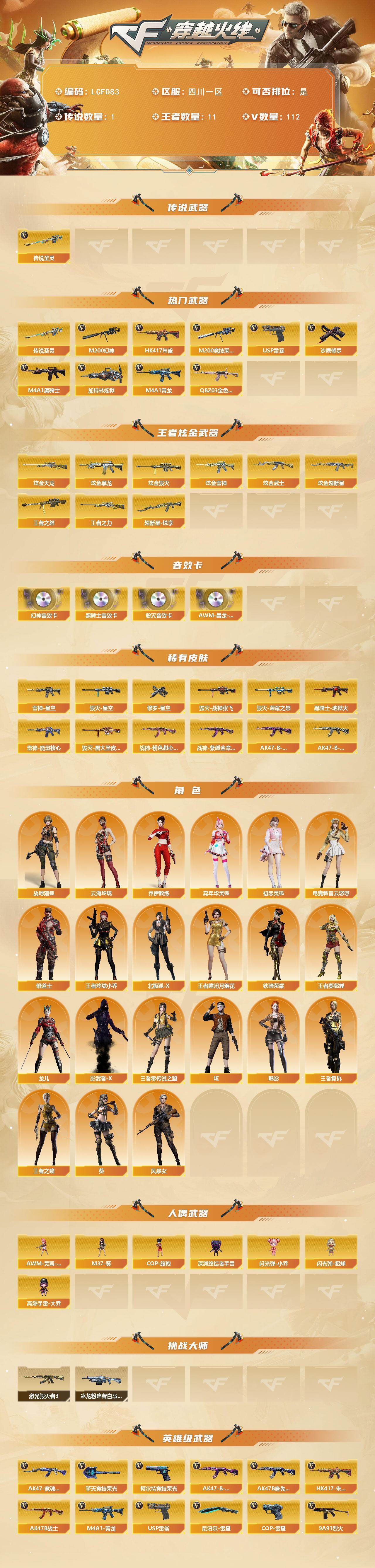 幻神音效卡 四川一区-120V-11王者武器数-6炫金武器数【传说武器】:传说圣灵【热门武器】:传说圣灵,QBZ03-金色蔷薇,HK417-朱雀,M4A1-青龙,M200-幻神,M200-竞技荣光,M4A1-黑骑士,加特林-炼狱,USP-雷暴,沙鹰-修罗*4【王者炫金武器】:超新星-悦享,王者之怒,王者之力,炫金黑龙,炫金雷神,炫金武士,炫金超新星,炫金毁灭,炫金天龙【音效卡】:M200-幻神音效卡,M4A1-黑骑士音效卡,Barrett-毁灭音效卡,AWM-昌龙-怀旧音效卡【皮肤】:雷神-能量