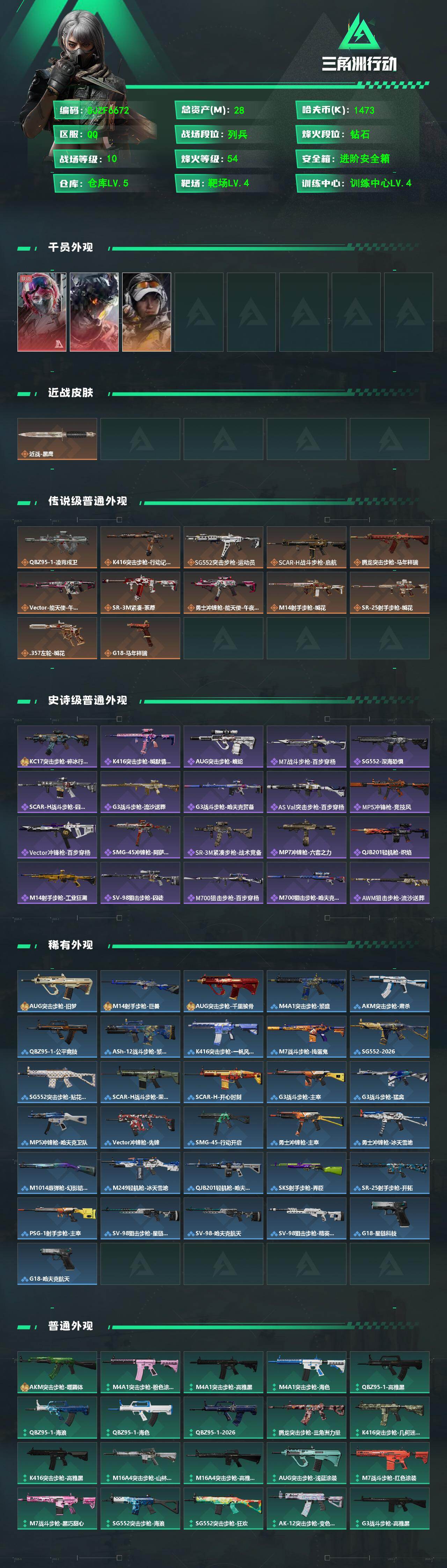 【SJZF6672】总资产(M):28M/哈夫币(K):1473K/哈夫币(K):1473K/传说枪皮数:12/全面战场等级:10_段位:列兵/烽火地带等级:54_段位:钻石/蛊-能天使午夜邮差/威龙-凌霄戍卫/露娜-金牌射手/近战-黑鹰/QBZ95-1突击步枪-凌霄戍卫/K416突击步枪-行动记录/SG552突击步枪-运动员/SCAR-H战斗步枪-启航/腾龙突击步枪-马年祥瑞/Vector冲锋枪-能天使-午夜邮差/SR-3M紧凑突击步枪-荼蘼/勇士冲锋枪-能天使-午夜邮差/M14射手步枪-缄花