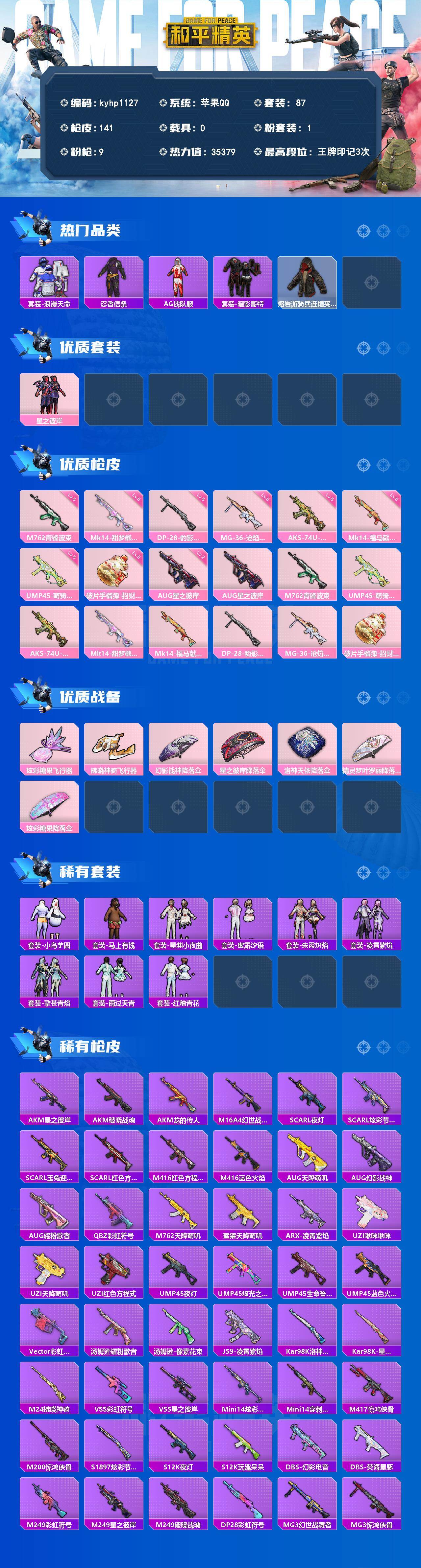 苹果 手Q-1粉装-9特效枪-0载具-2粉色飞行器-35379热力值-3王牌印记-87套装-141枪皮
