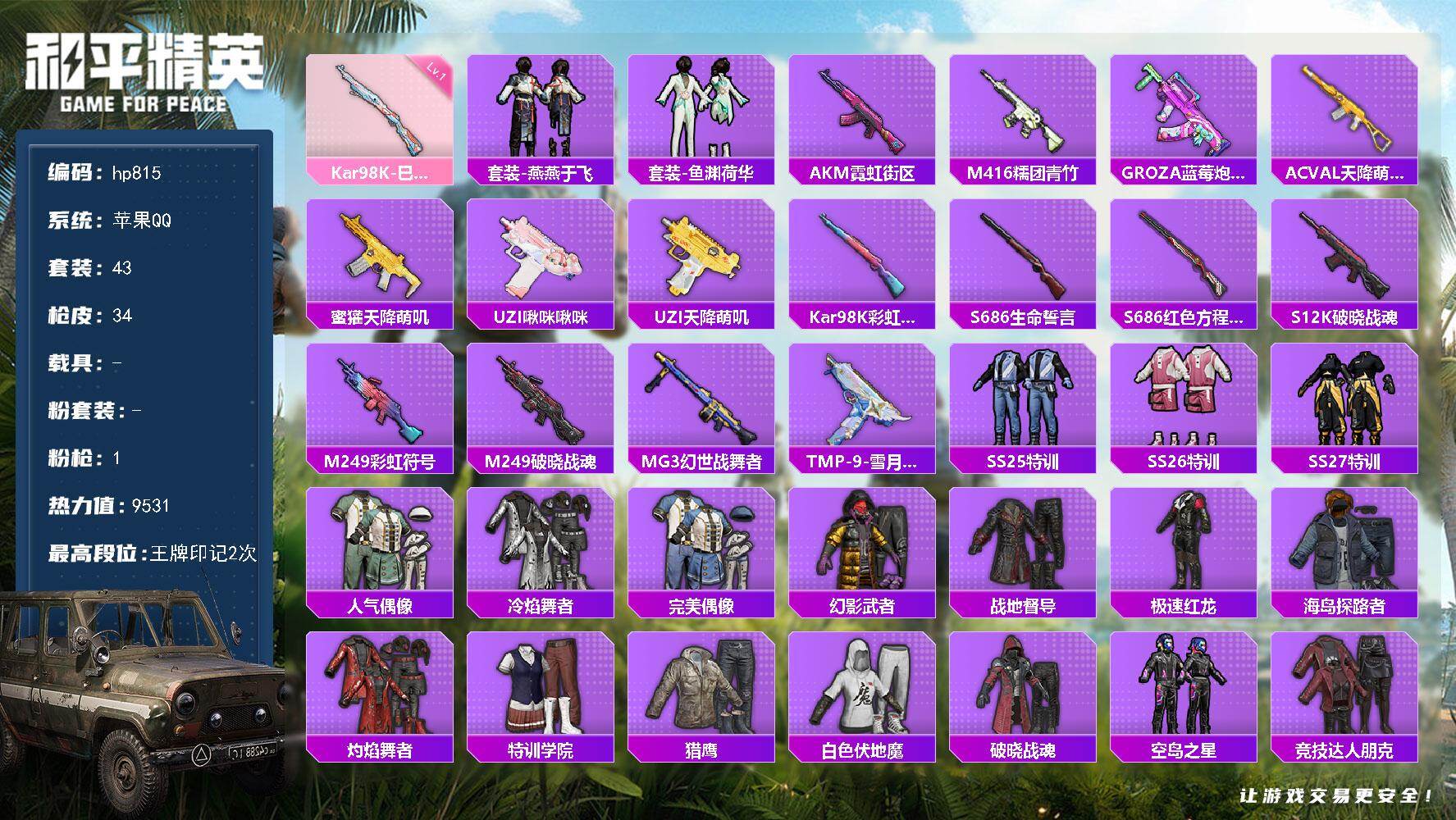 苹果 手Q-0粉装-1特效枪-0载具-0粉色飞行器-9531热力值-2王牌印记-43套装-34枪皮