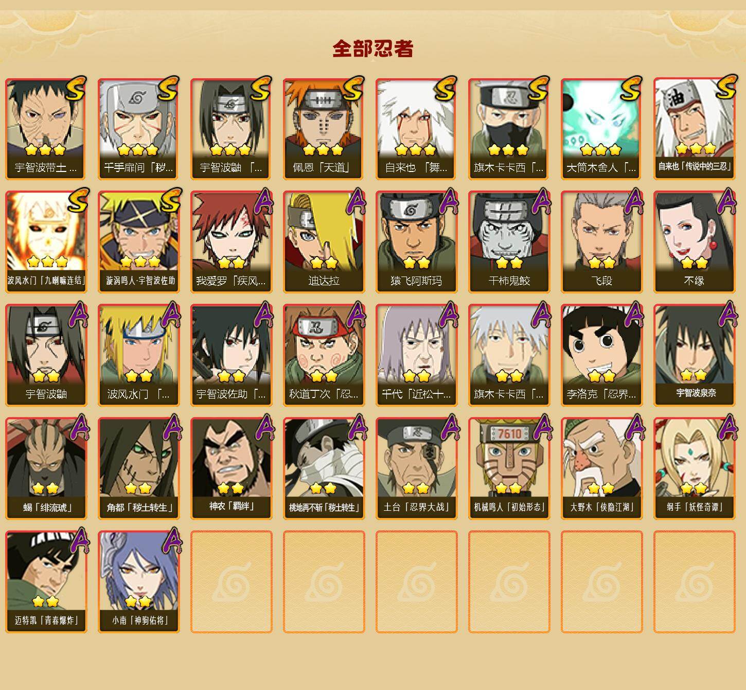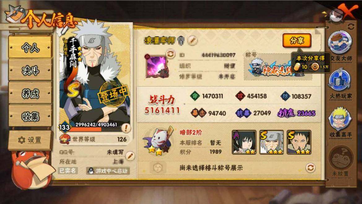 【HYYH1302】V7/战力516W/S忍10/A忍24/2星大野木「侠隐江湖」/疾风传-我爱罗/3星波风水门「九喇嘛连结」/宇智波鼬/须佐能乎-旗木卡卡西/2星小南「神驹佑将」/忍界大战-宇智波带土/天道-佩恩/3星漩涡鸣人·宇智波佐助/最终章-大筒木舍人/忍界大战-秋道丁次/2星角都「秽土转生」/秽土转生-千手扉间/忍界大战-李洛克/2星土台「忍界大战」/青年-波风水门/2星蝎「绯流琥」/舞之豪杰-自来也/2星桃地再不斩「秽土转生」/3星自来也「传说中的三忍」/2星纲手「妖怪奇谭」/飞段/