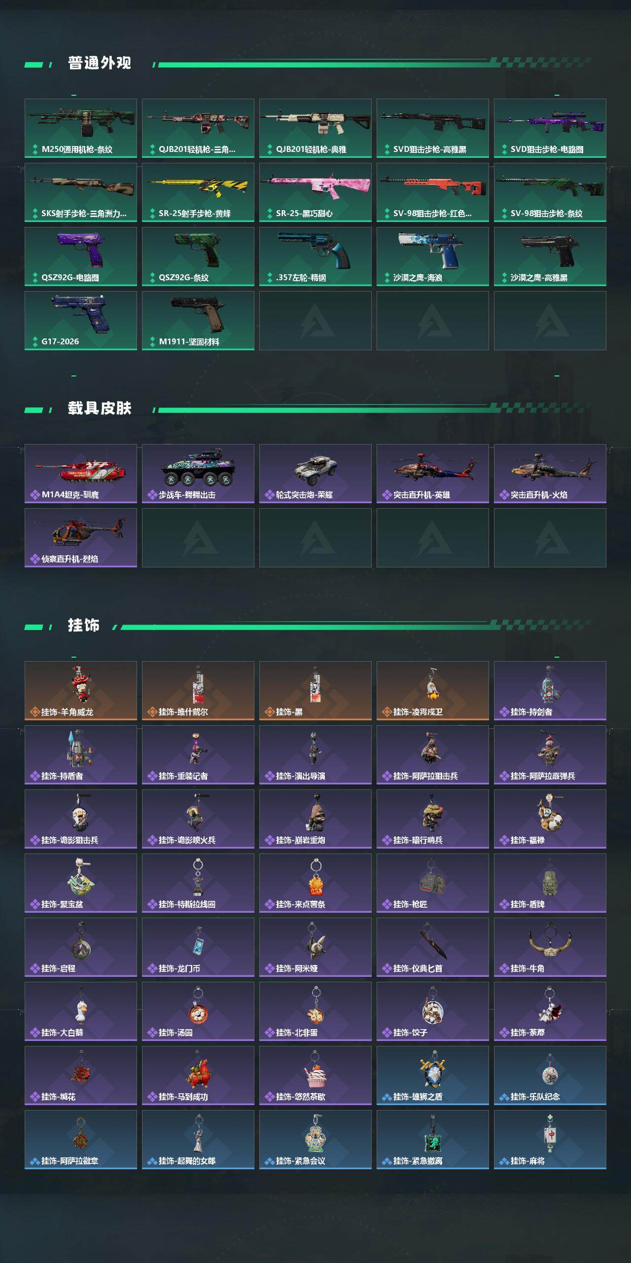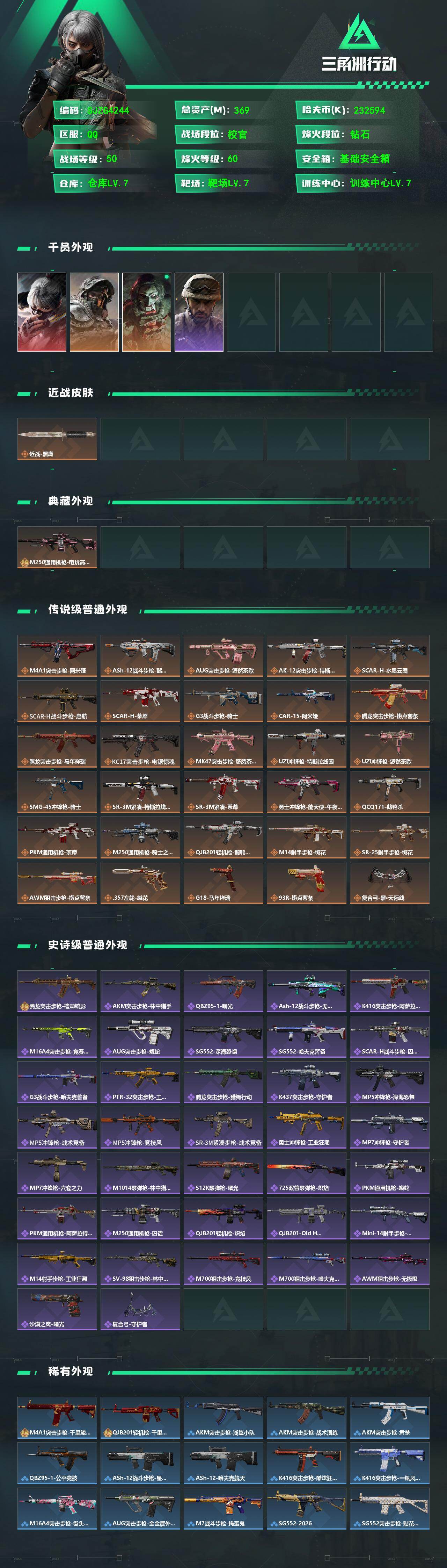 【SJZG4244】总资产(M):369M/哈夫币(K):232594K/哈夫币(K):232594K/传说枪皮数:31/全面战场等级:50_段位:校官/烽火地带等级:60_段位:钻石/骇爪-水墨云图/深蓝-不破誓约/红狼-电锯惊魂/蜂医-黑鹰坠落/近战-黑鹰/M250通用机枪-电玩高手S2/M250通用机枪-电玩高手S2(极品S)/M4A1突击步枪-阿米娅/ASh-12战斗步枪-鹅鸭杀/AUG突击步枪-悠然茶歇/AK-12突击步枪-特斯拉线圈/SCAR-H战斗步枪-水墨云图/SCAR-H战斗步