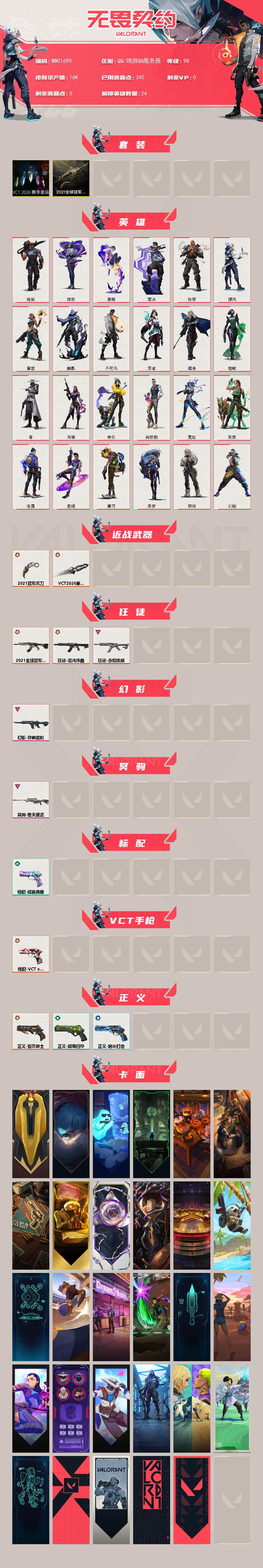 【WWC1690】终极*6/卓越*3/皮肤*14/等级*98/段位:铂金/2021全球冠军赛套装/VCT 2026 赛季套装/幻棱/炼狱/维斯/暮蝶/壹决/铁臂/捷风/雷兹/幽影/不死鸟/贤者/猎枭/蝰蛇/零/芮娜/奇乐/尚勃勒/霓虹/斯凯/夜露/星礈/盖可/黑梦/钢锁/近战武器-2021全球冠军赛 爪刀/近战武器-VCT 2026 篆刀/狂徒-2021全球冠军赛/狂徒-混沌序曲/狂徒-赤焰铁骥/幻影-异鳞魔蛇/冥驹-堕天遗武/标配-超能偶像/标配-VCT x T1/正义-毁灭骑士/正义-超限闪