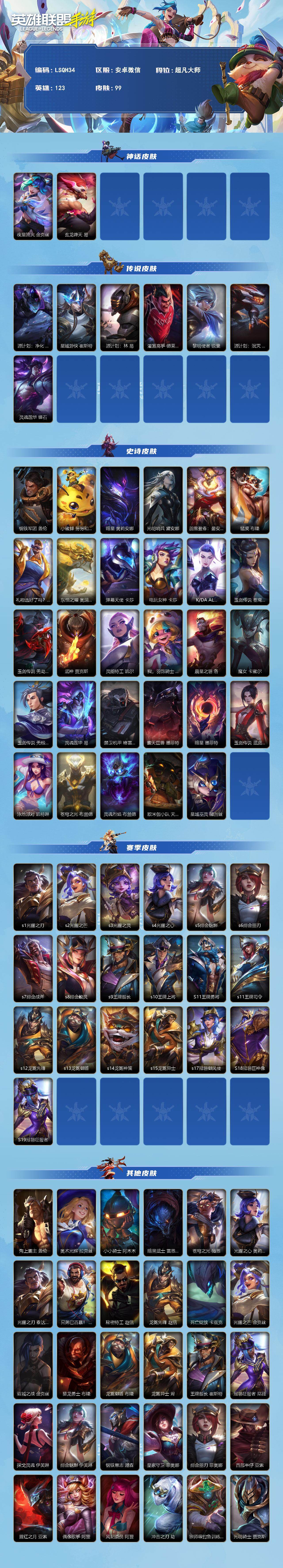 【LSQH34】123英雄/99皮肤/1神话/10传说/43史诗/超凡大师/夜星流火 金克丝/玄龙绛天 易/源计划:净化 薇恩/星域游侠 崔斯特/源计划:林 易/灌篮高手 德莱厄斯/黎明使者 锐雯/源计划:泯灭 雷克顿/灵魂莲华 锤石/钢铁军团 盖伦/小蜜蜂 努努和威朗普/暗星 奥莉安娜/光明哨兵 黛安娜/蕊雪盈春:晏安 赫卡里姆/猛虎 布隆/礼物选好了吗? 布隆/东恒之曜 奥瑞利安·索尔/弹幕天使 卡莎/电玩女神 卡莎/K/DA ALL OUT 卡莎/玉剑传说 苍鸾 莫甘娜/玉剑传说 无劫 劫