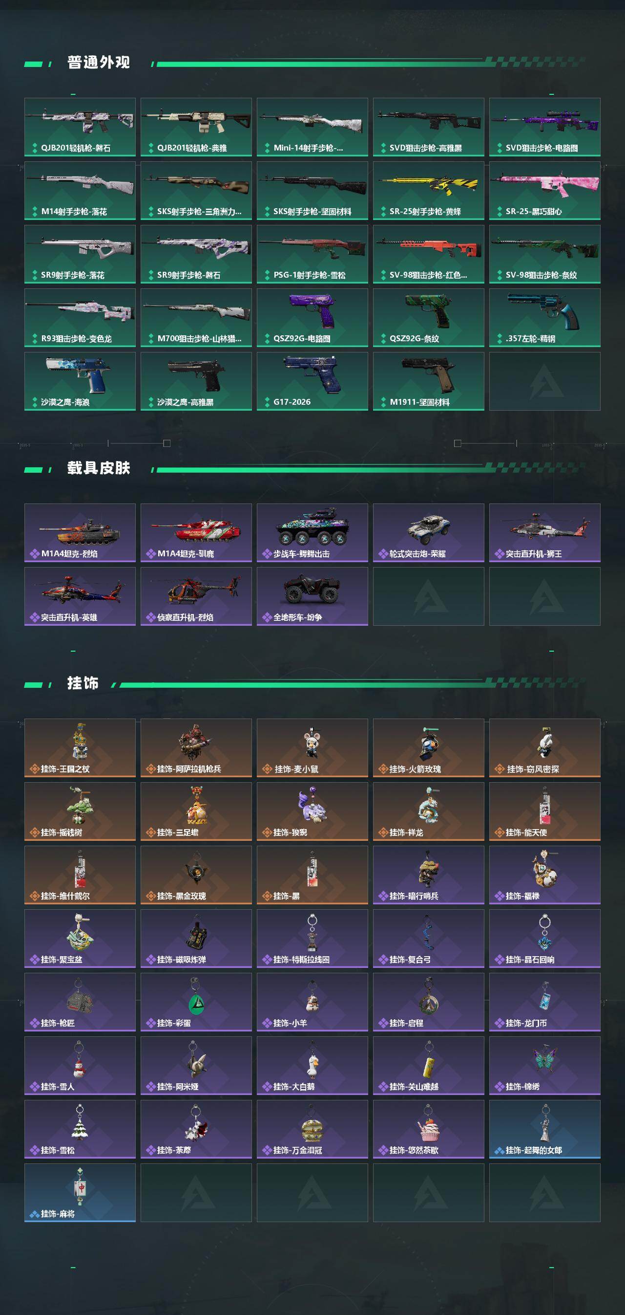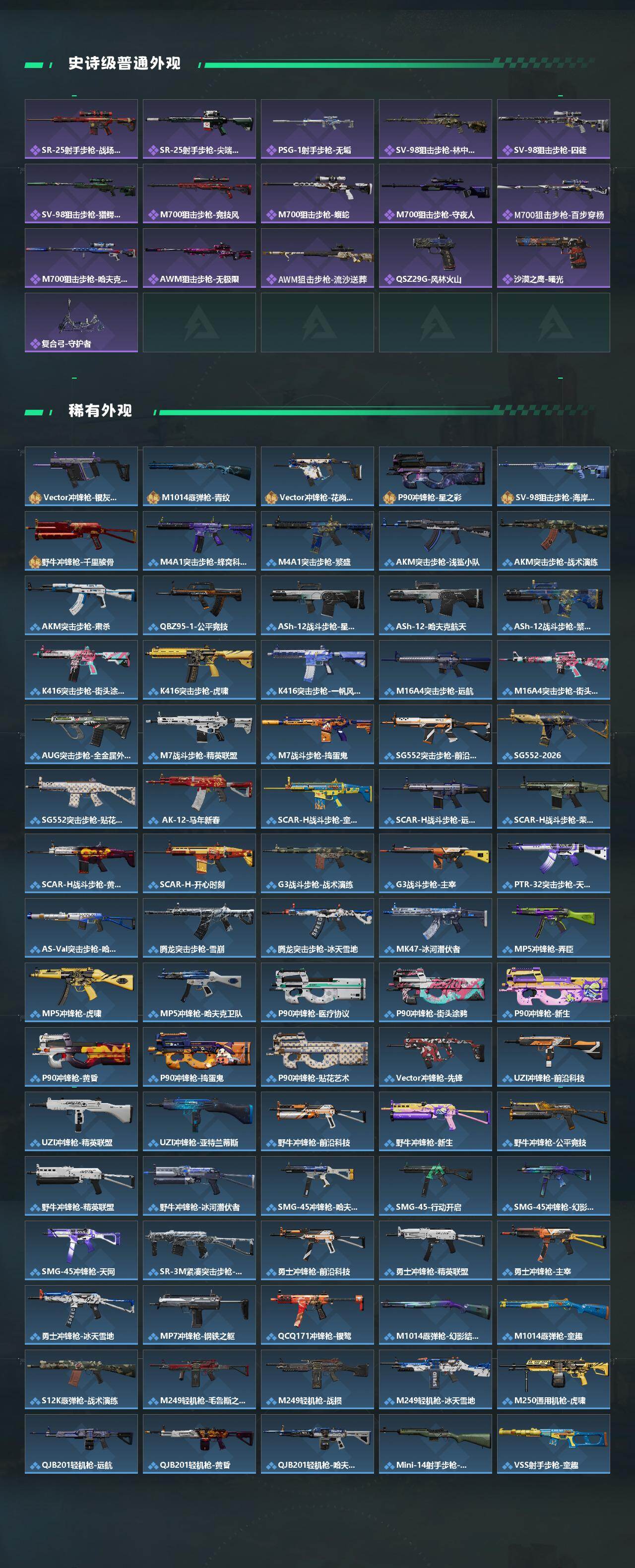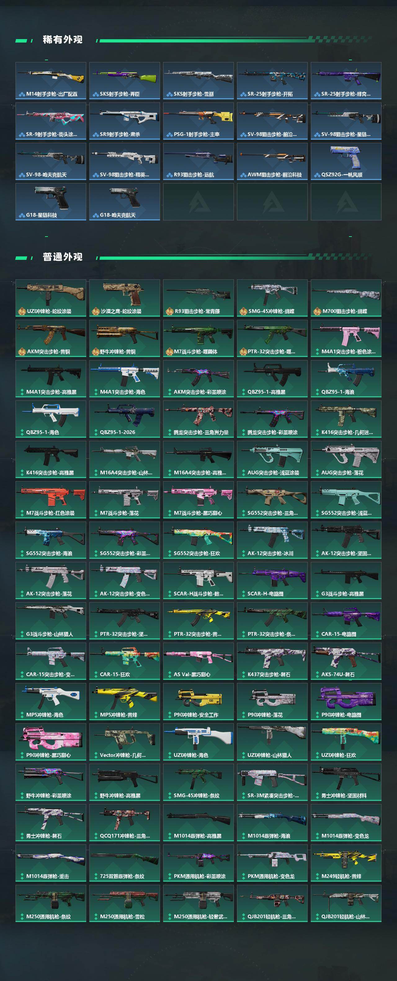 【传说外观】:M4A1突击步枪-蚀金玫瑰,M4A1突击步枪-阿米娅,AKM突击步枪-锦绣,ASh-12战斗步枪-鹅鸭杀,K416突击步枪-行动记录,AUG突击步枪-悠然茶歇,SG552突击步枪-运动员,AK-12突击步枪-夜鹰,AK-1