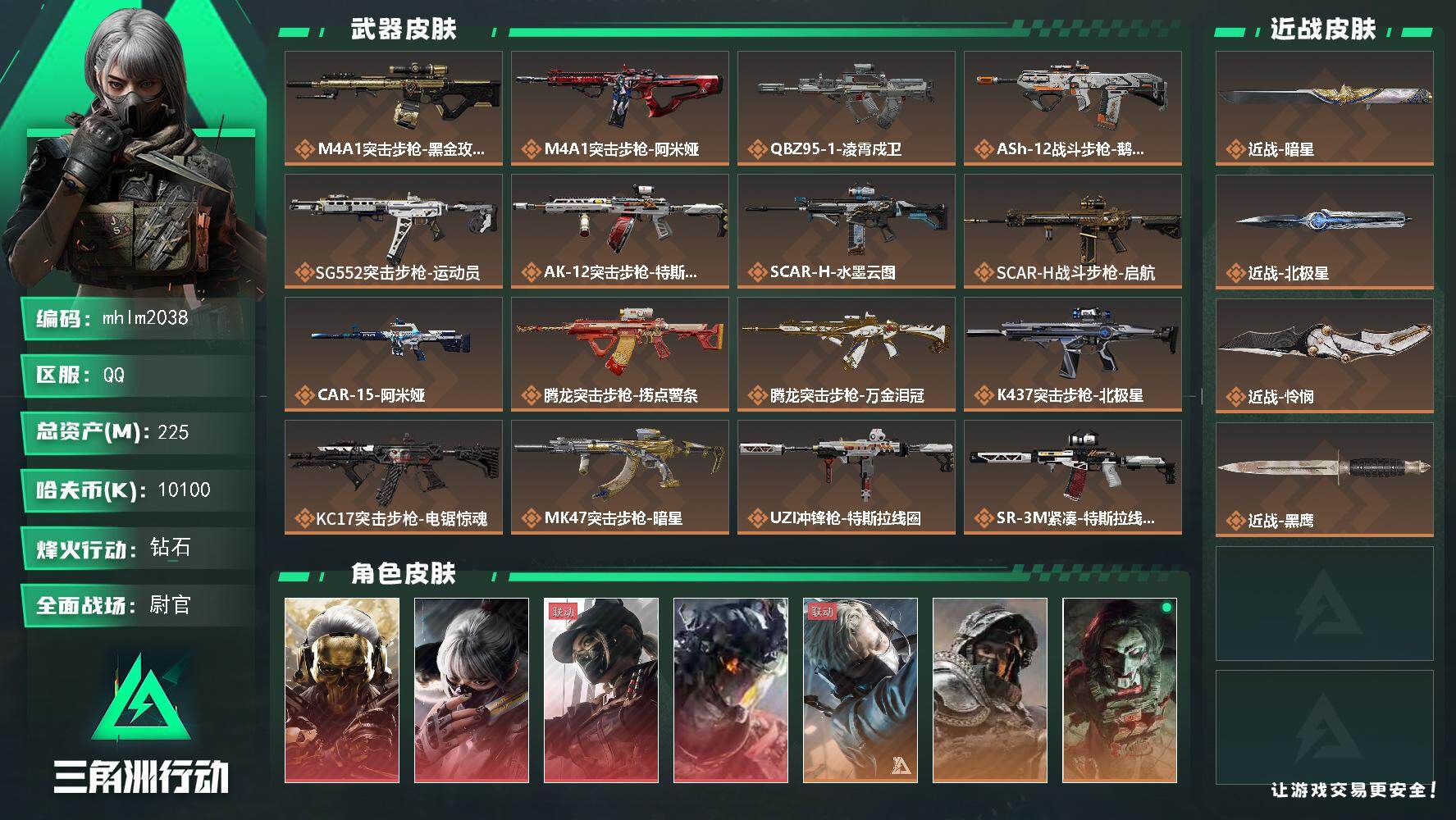 225m总资产-10100k哈夫币-60烽火等级-钻石-50战场等级-尉官【