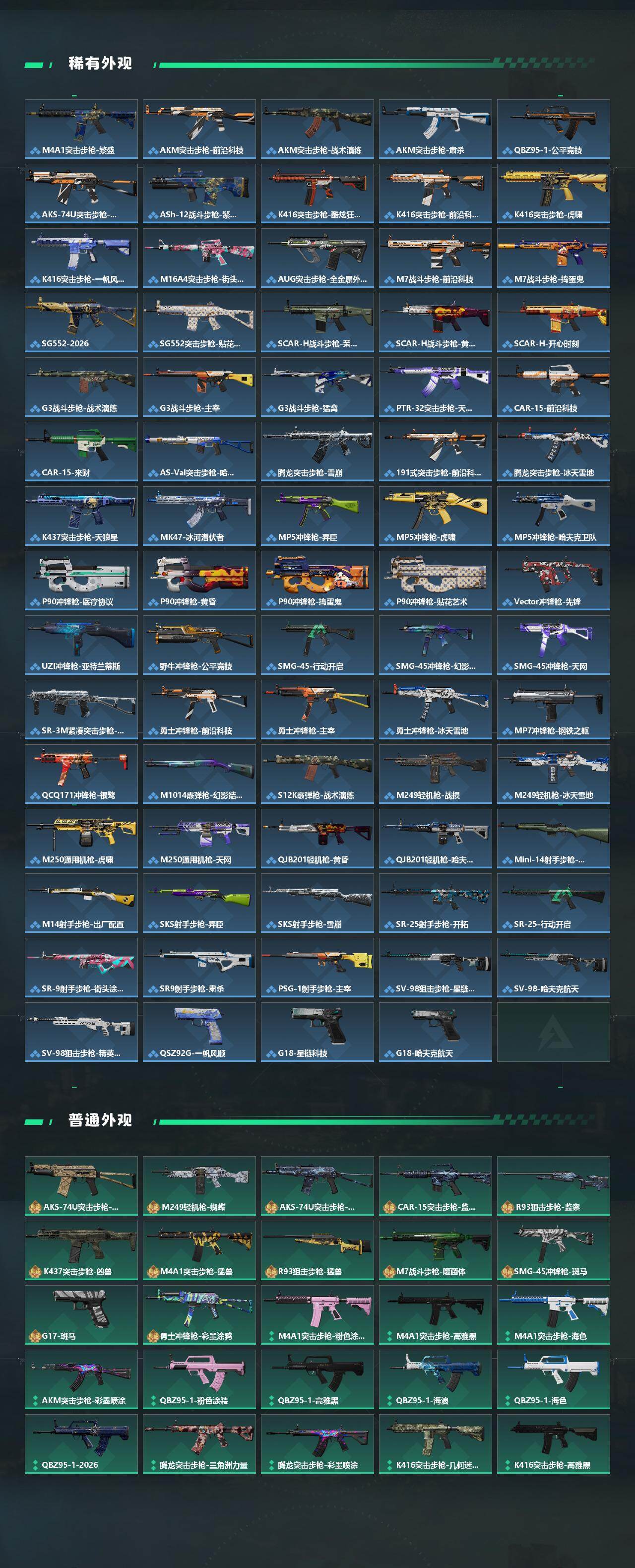 【传说外观】:M4A1突击步枪-蚀金玫瑰,M4A1突击步枪-阿米娅,QBZ95-1突击步枪-凌霄戍卫,ASh-12战斗步枪-鹅鸭杀,SG552突击步枪-运动员,AK-12突击步枪-特斯拉线圈,SCAR-H战斗