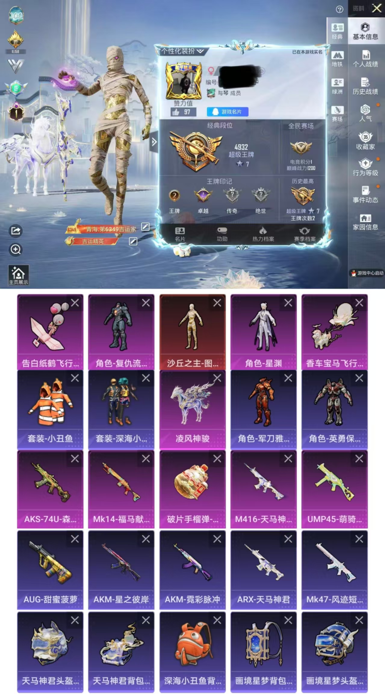 【5特效枪】AKS-74U-森灵之息[5级],M416-天马神君[3级],Mk14-福马献瑞[5级],UMP45-萌骑冒险[3级],破片手榴弹-招财进宝[5级]