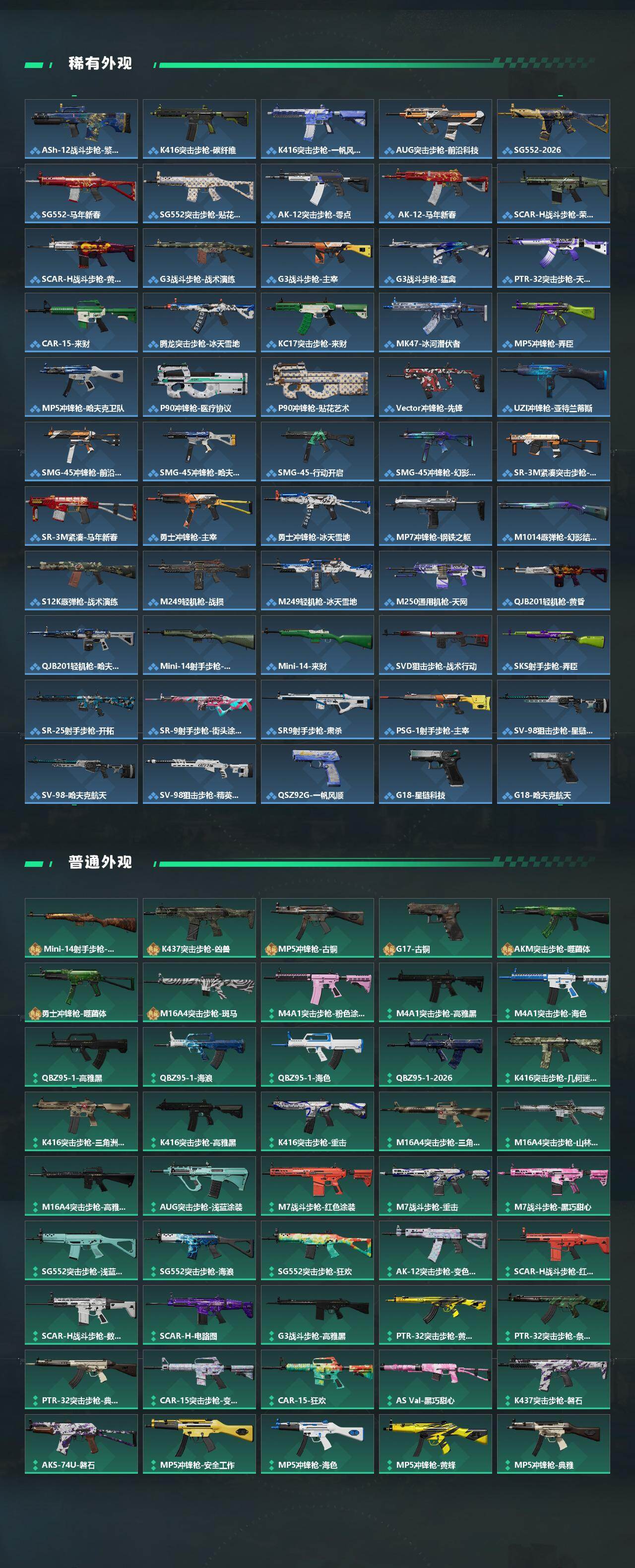 【传说外观】:M4A1突击步枪-阿米娅,AKM突击步枪-锦绣,QBZ95-1突击步枪-凌霄戍卫,K416突击步枪-行动记录,AUG突击步枪-悠然茶歇,SG552突击步枪-运动员,SCAR-H战