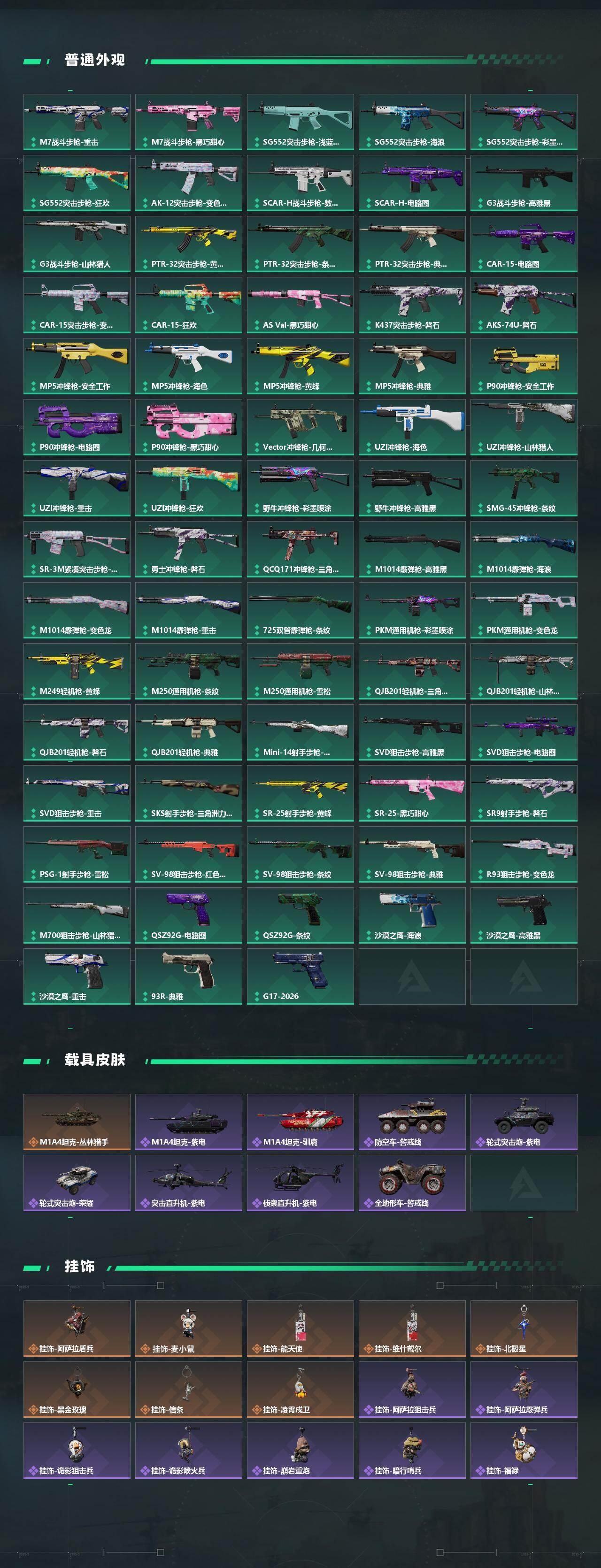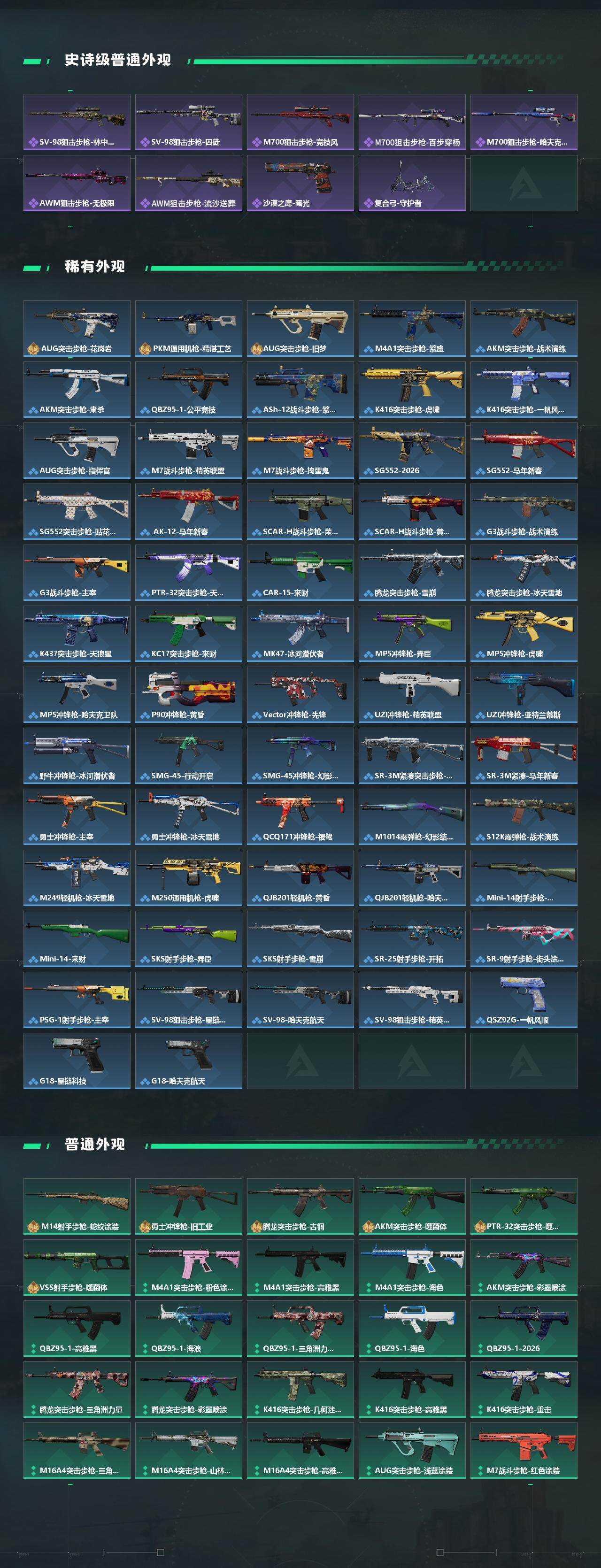 【传说外观】:M4A1突击步枪-蚀金玫瑰,M4A1突击步枪-阿米娅,ASh-12战斗步枪-鹅鸭杀,K416突击步枪-