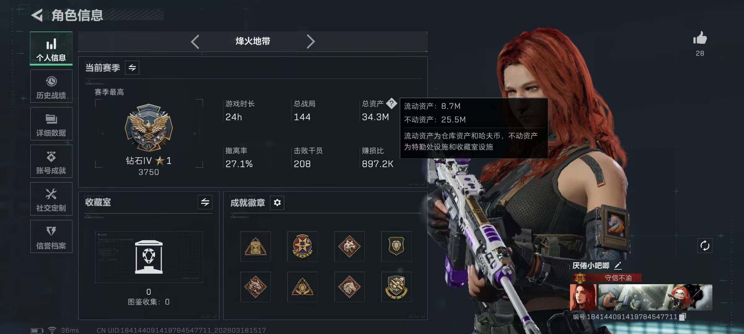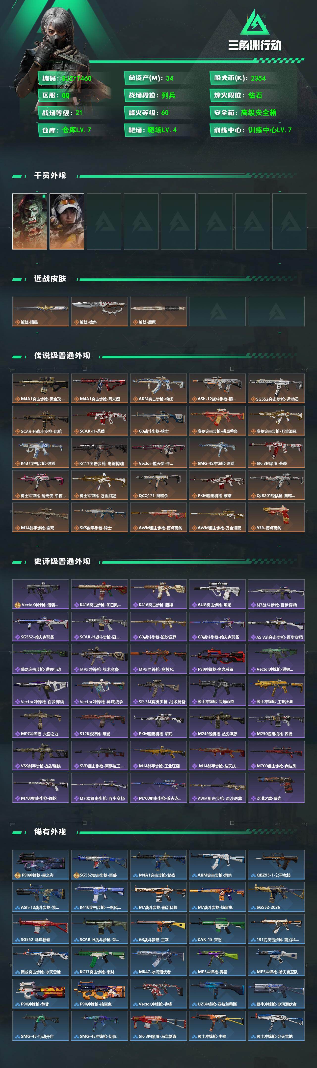 34m总资产-2354k哈夫币-60烽火等级-钻石-21战场等级-列兵