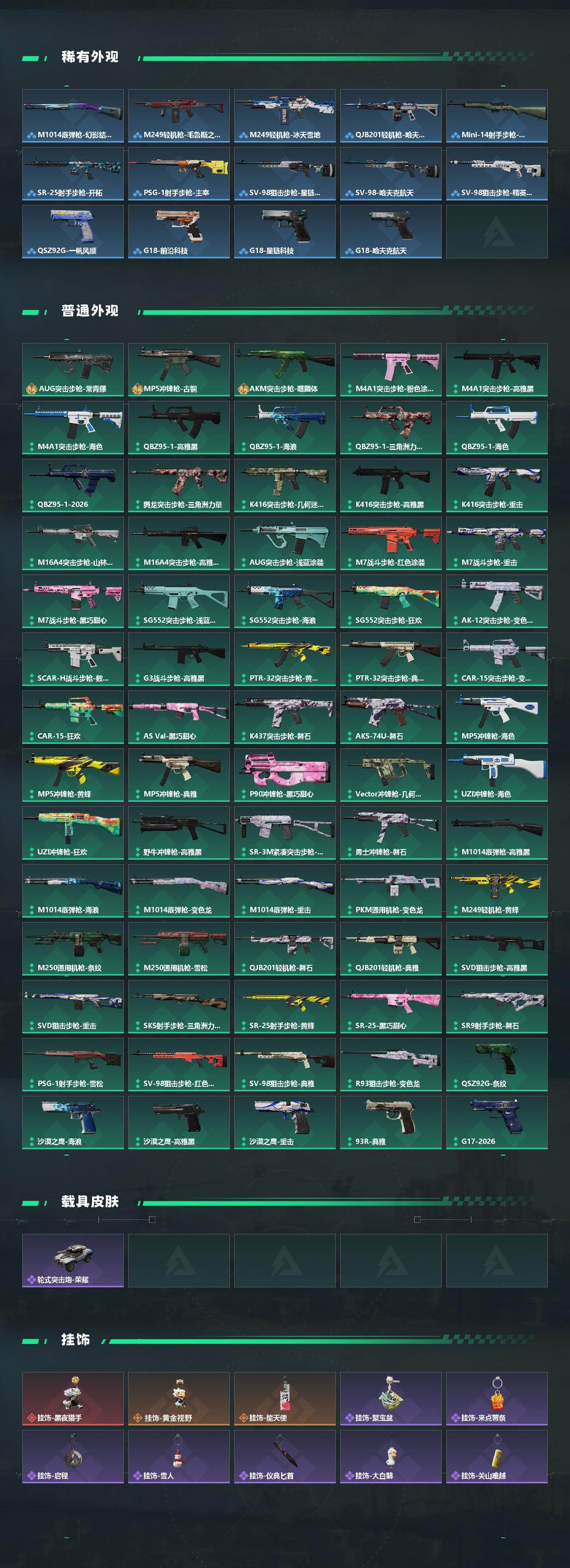 【传说外观】:M4A1突击步枪-蚀金玫瑰,M4A1突击步枪-阿米娅,AKM突击步枪-锦绣,ASh-12战斗步枪-鹅鸭杀,SG552突击步枪-运动员,SCAR-H战斗步枪-启航,SCAR-H战斗步枪-荼蘼,G3战斗步枪-骑士,腾龙突击步枪-捞点薯条,腾龙突击步枪-万金泪冠,K437突击步枪-锦绣,KC17突击步枪-电锯惊魂,Vect