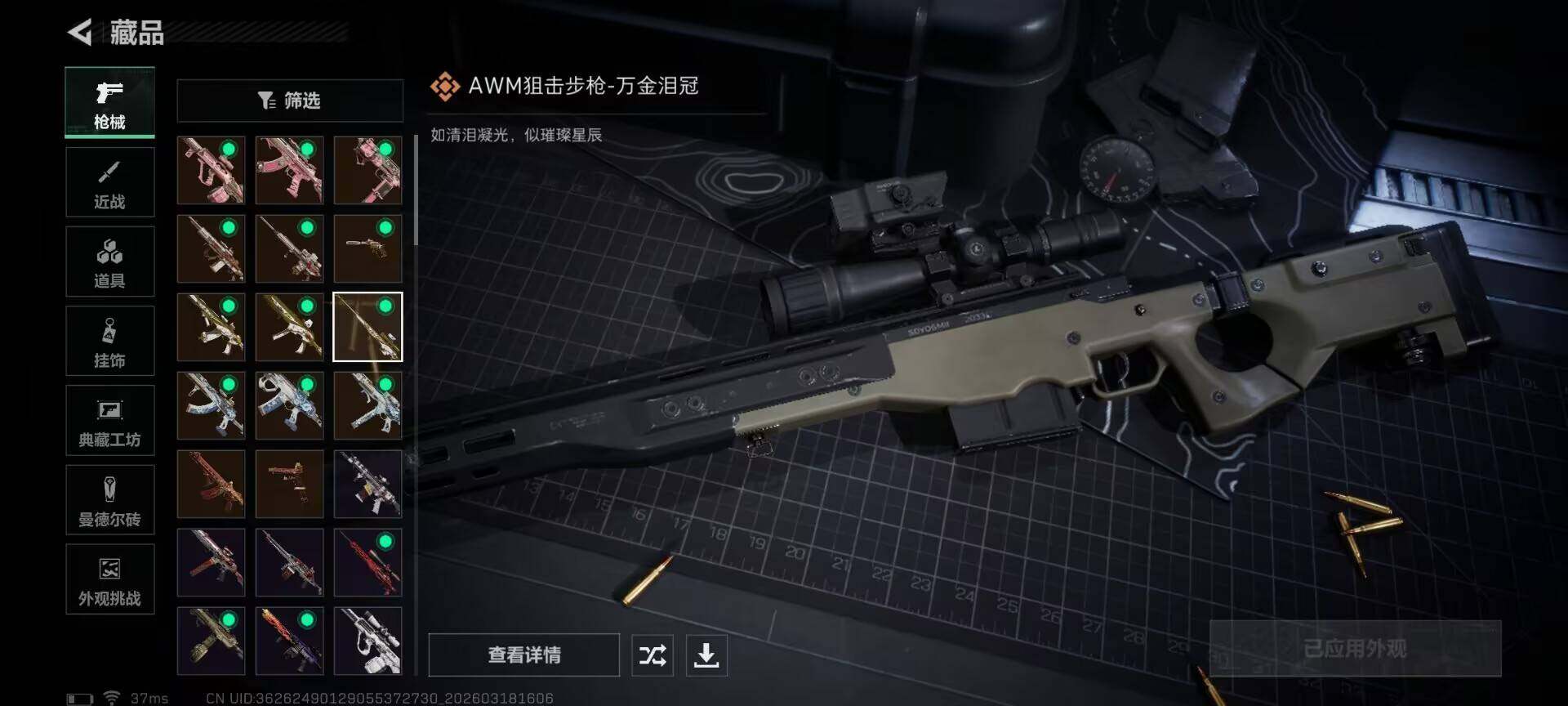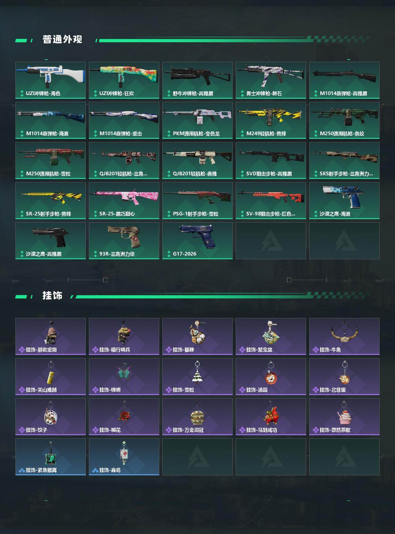 【传说外观】:AKM突击步枪-锦绣,AUG突击步枪-悠然茶歇,腾龙突击步枪-马年祥瑞,腾龙突击步枪-万金泪冠,K437突击步枪-锦绣,MK47突击步枪-悠然茶歇,UZI冲锋枪-悠然茶歇,SMG-45冲锋枪-锦绣,勇士冲锋枪-万金泪冠,M14射手步枪-缄花,SR-25射手步枪-缄花,AWM狙击步枪-万金泪冠,.357左轮-缄花,G18-马年祥瑞