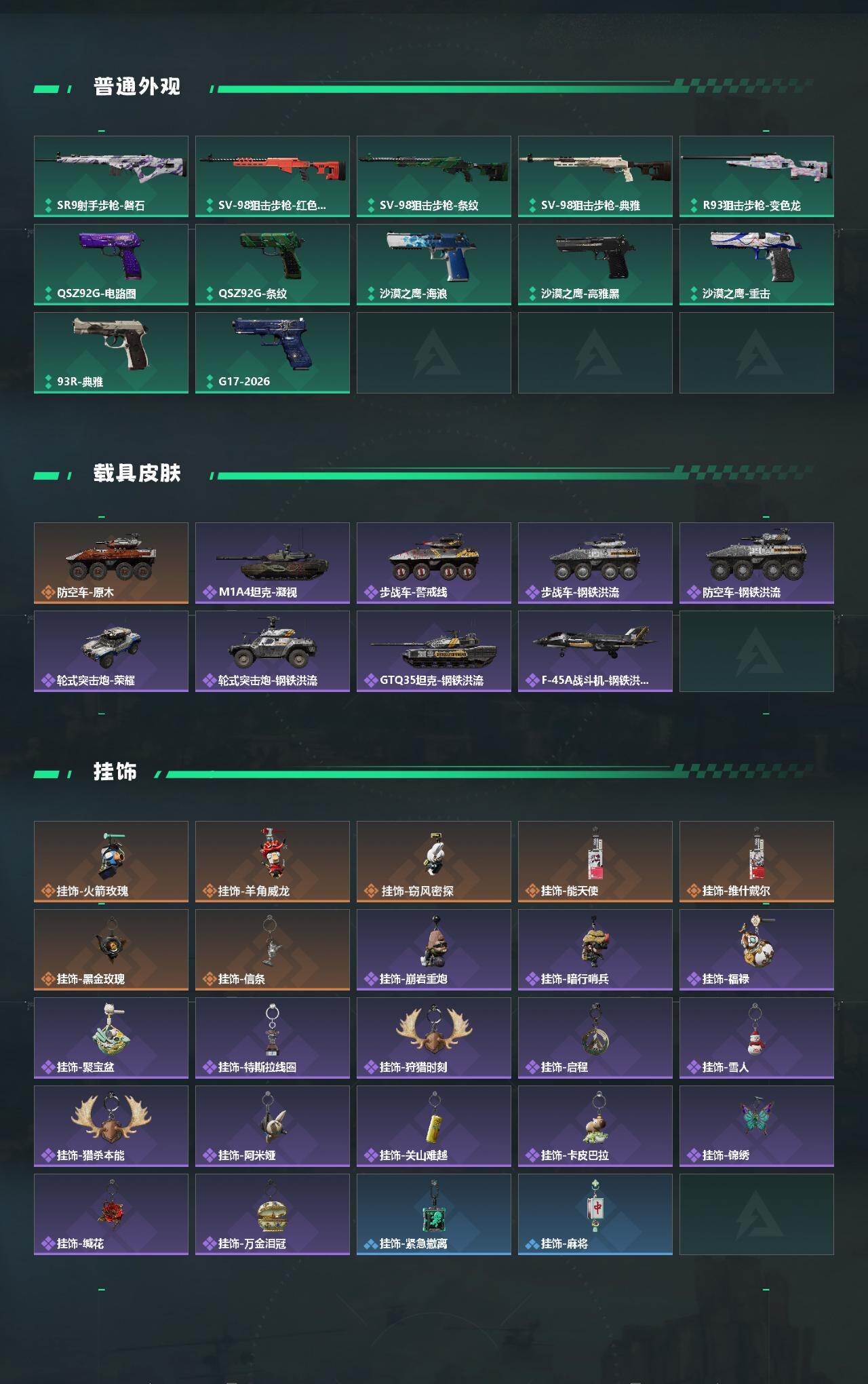 【传说外观】:M4A1突击步枪-蚀金玫瑰,M4A1突击步枪-阿米娅,AKM突击步枪-锦绣,M16A4突击步枪-狩猎时刻,SG552突击步枪-运动员,AK-12突击步枪-特斯拉线圈,SCAR-H战斗步枪-启航,G3战斗步枪-狩猎时刻,腾龙突击步枪-万金泪