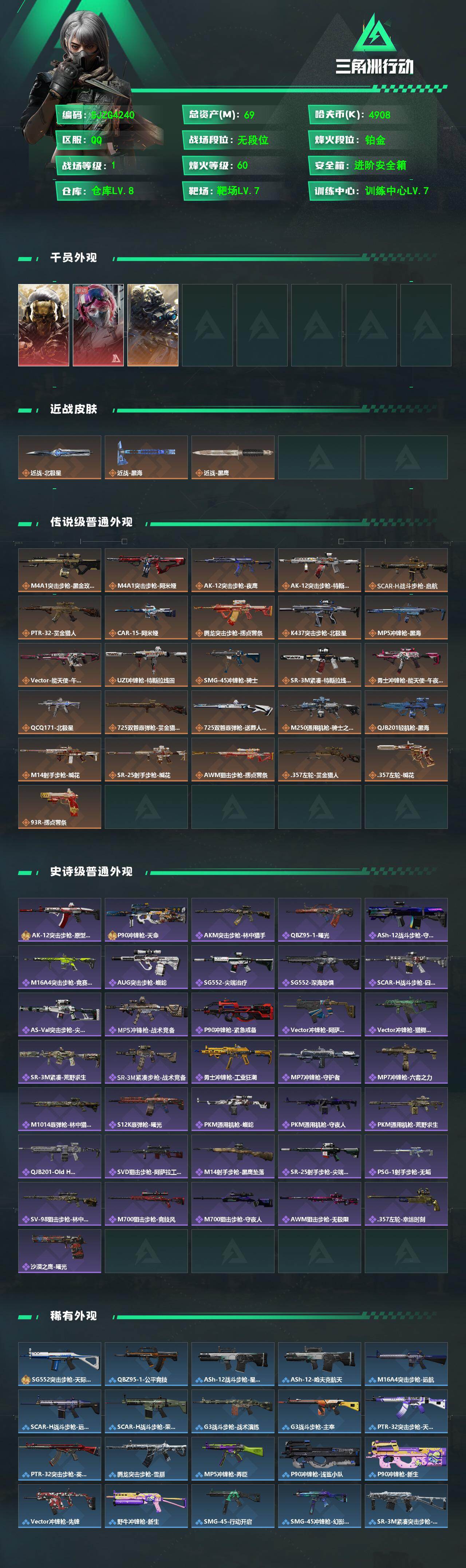 【SJZG4240】总资产(M):69M/哈夫币(K):4908K/哈夫币(K):4908K/传说枪皮数:26/全面战场等级:1_段位:无段位/烽火地带等级:60_段位:铂金/红狼-蚀金玫瑰/蛊-能天使午夜邮差/无名-夜鹰/近战-北极星/近战-黑海/近战-黑鹰/M4A1突击步枪-蚀金玫瑰/M4A1突击步枪-阿米娅/AK-12突击步枪-夜鹰/AK-12突击步枪-特斯拉线圈/SCAR-H战斗步枪-启航/PTR-32突击步枪-赏金猎人/CAR-15突击步枪-阿米娅/腾龙突击步枪-捞点薯条/K437突击