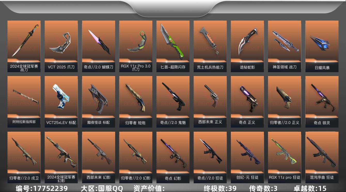 【特价出售/店主推荐】【套装】:2024全球冠军赛套装,VCT 2025 赛季套装,西部未来套装,归零者//2.0套装,奇点//2.0套装,回火礼包:奇点套装,般若假面//2.0套装,掠影套装【英雄】:幻棱,炼狱,维斯,暮蝶,钛狐,壹决,铁臂,捷风,雷兹,幽影,不死鸟,贤者,猎枭,蝰蛇,零,芮娜,奇乐,尚勃勒,霓虹,斯凯,夜露,星礈,K/O,海神,盖可,黑梦,钢锁【近战武器】:近战武器-2024全球冠军赛 战刀,近战武器-奇点//2.0 蝴蝶刀,近战武器-VCT 2025 爪刀,近战武器-RGX