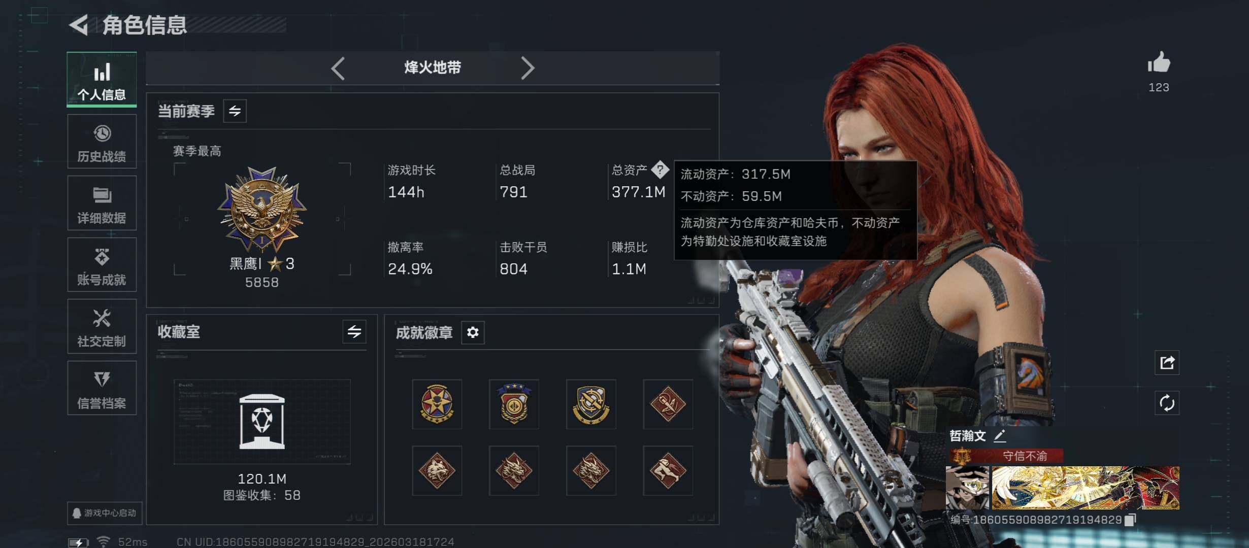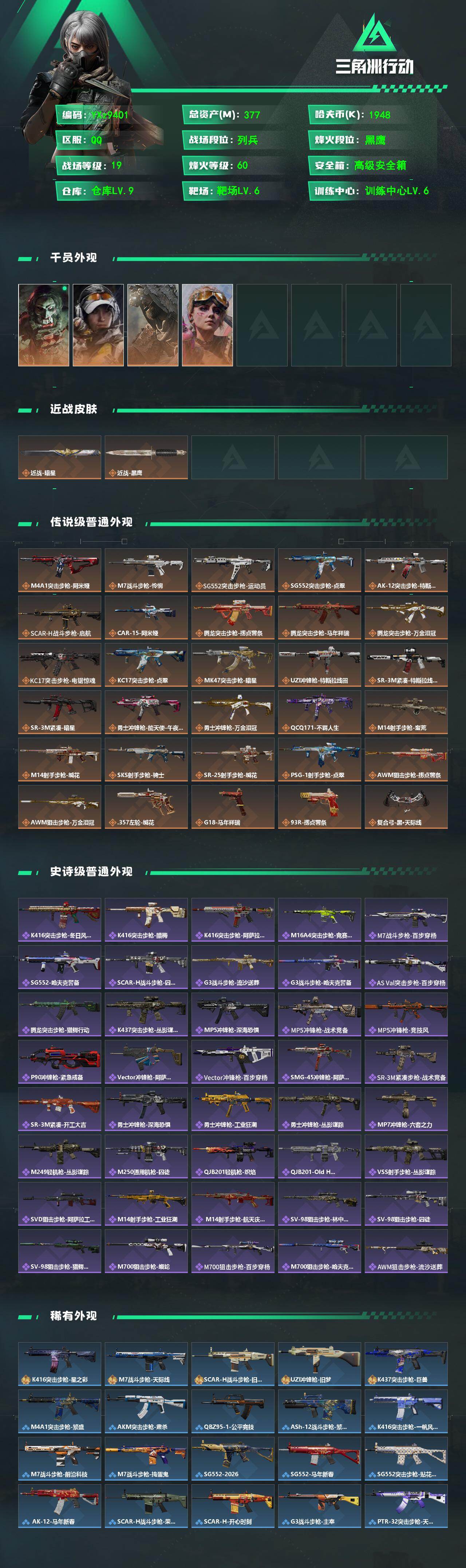 【高额资产377M+四金皮+单刀皮-暗星.猛攻必备】【Q区三端互通】【无二次】YXz9401-特勤处:仓库9级/靶场6级/训练中心6级-总资产377m-哈夫币194w-烽火等级:60级