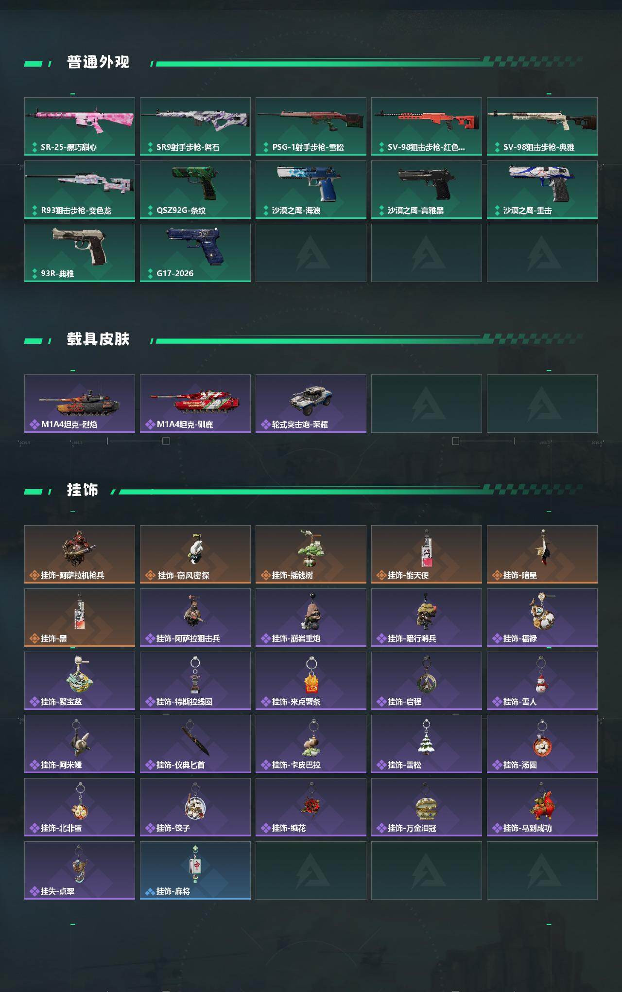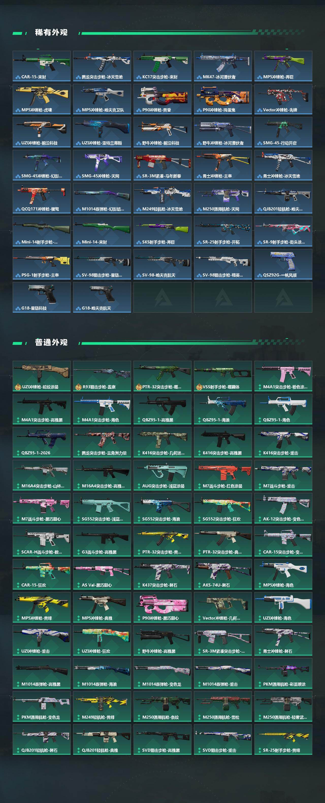 【传说外观】:M4A1突击步枪-阿米娅,M7战斗步枪-怜悯,SG552突击步枪-运动员,SG552突击步枪-点翠,AK-12突击步枪-特斯拉线圈,SCAR-H战斗步枪-启航,CAR-15突击步枪-阿