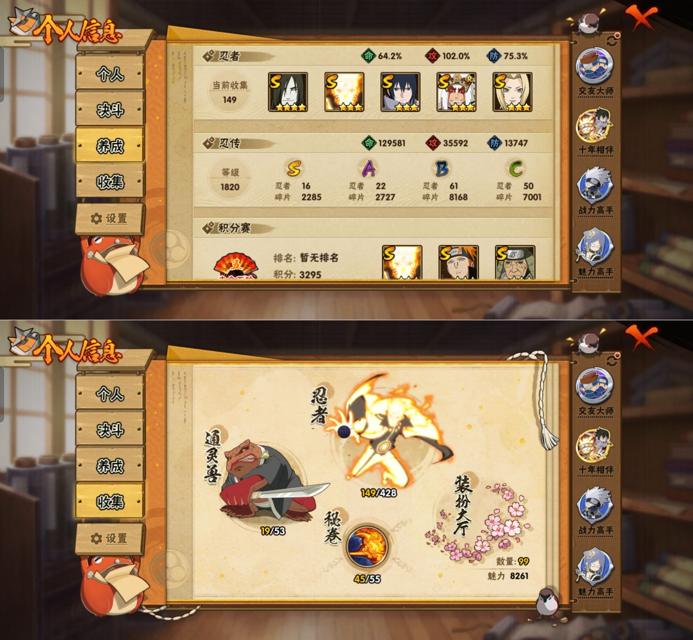 MHY4010有二次 【区服】3000【等级】146【S级数量】16【A级数量】22【B级数量】61【C级数量】50【S级】漩涡鸣人「九喇嘛连结」 纲手 艾「忍界大战」 迈特凯「死门」 猿飞日斩「秽土转生」 猿飞日斩 宇智波止水「须佐能乎」 宇智波斑「白面具」 波风水门 自来也「舞之豪杰」 宇智波斑「秽土转生·解」 神秘面具男「红夜之刃」 大野木「忍界大战」 大蛇丸 宇智波佐助「永恒万花筒」 佩恩「天道」