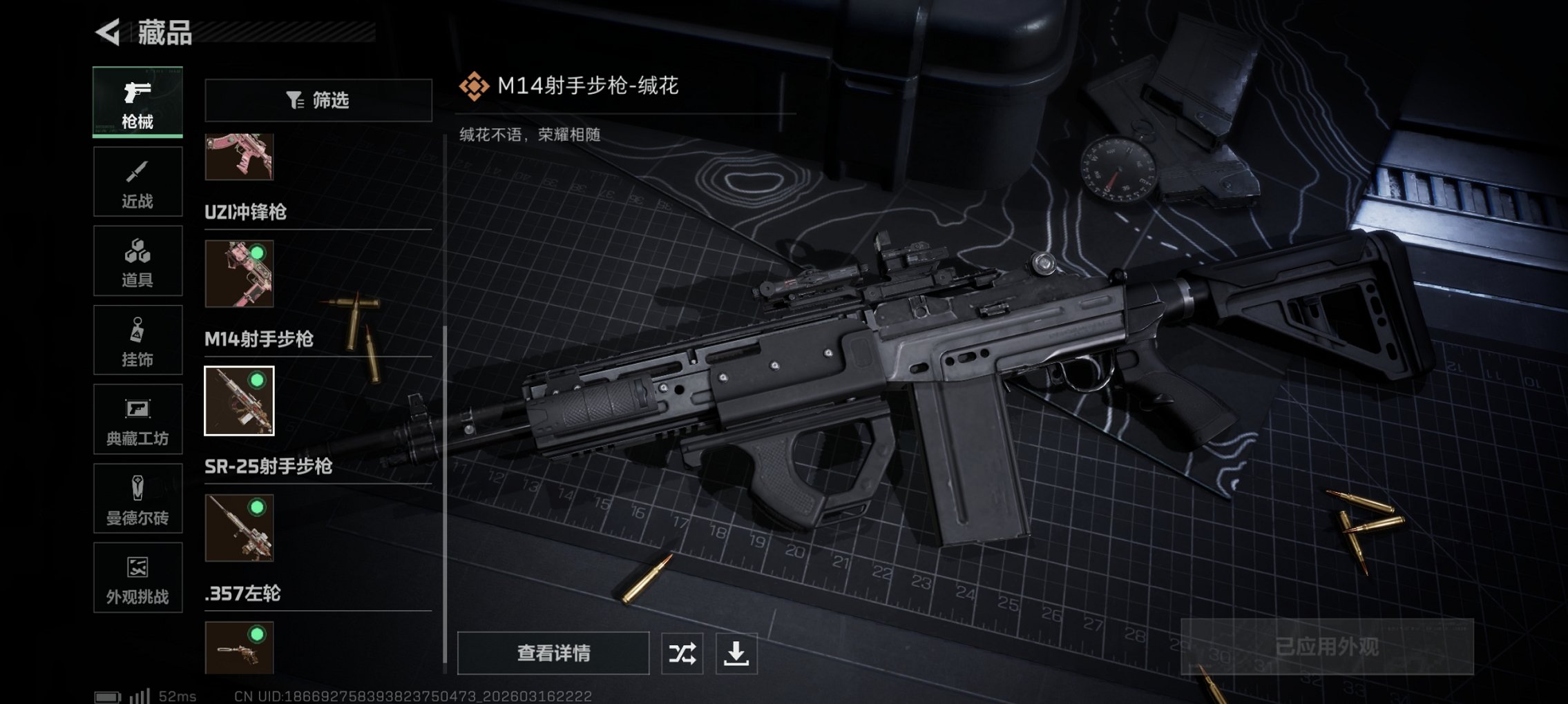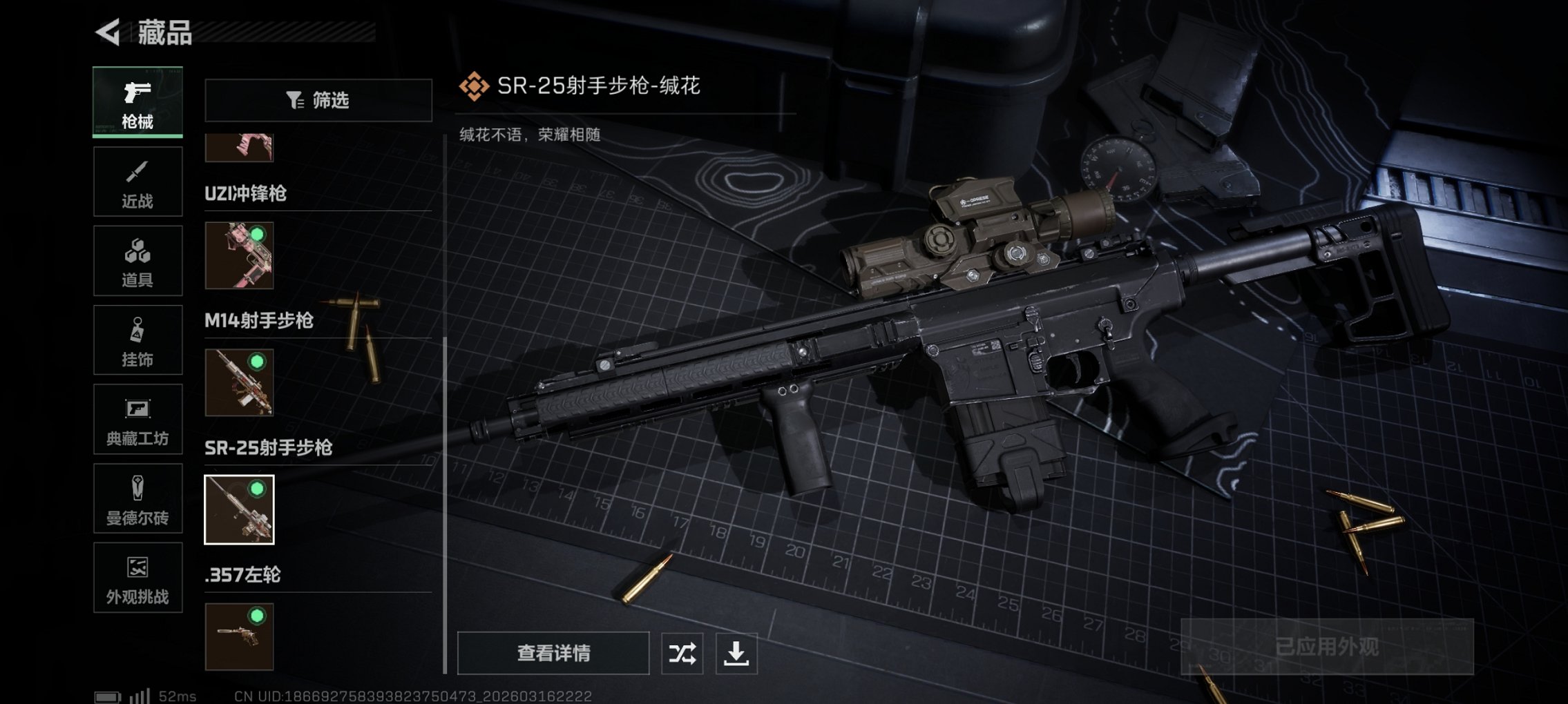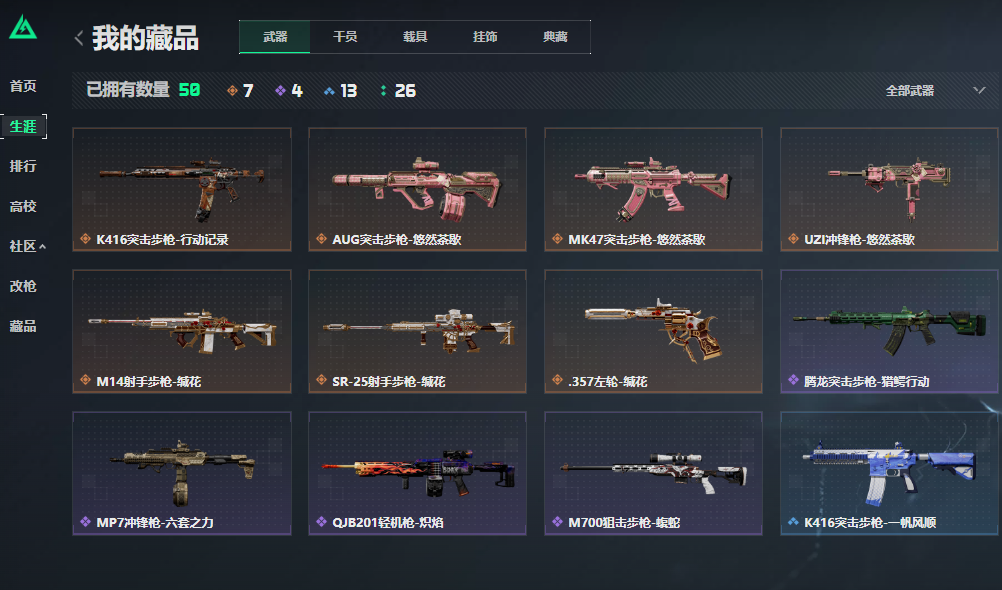 【枪皮】 M4A1突击步枪-高雅黑 QBZ95-1突击步枪-高雅黑 G3战斗步枪-高雅黑 M4A1突击步枪-海色 QBZ95-1突击步枪-海色 PTR-32突击步枪-黄蜂 QBZ191突击步枪-三角洲力量 M16A4突击步枪-三角洲力量 K416突击步枪-高雅黑 M700狙击步枪-蝮蛇 SV-98狙击步枪-星链科