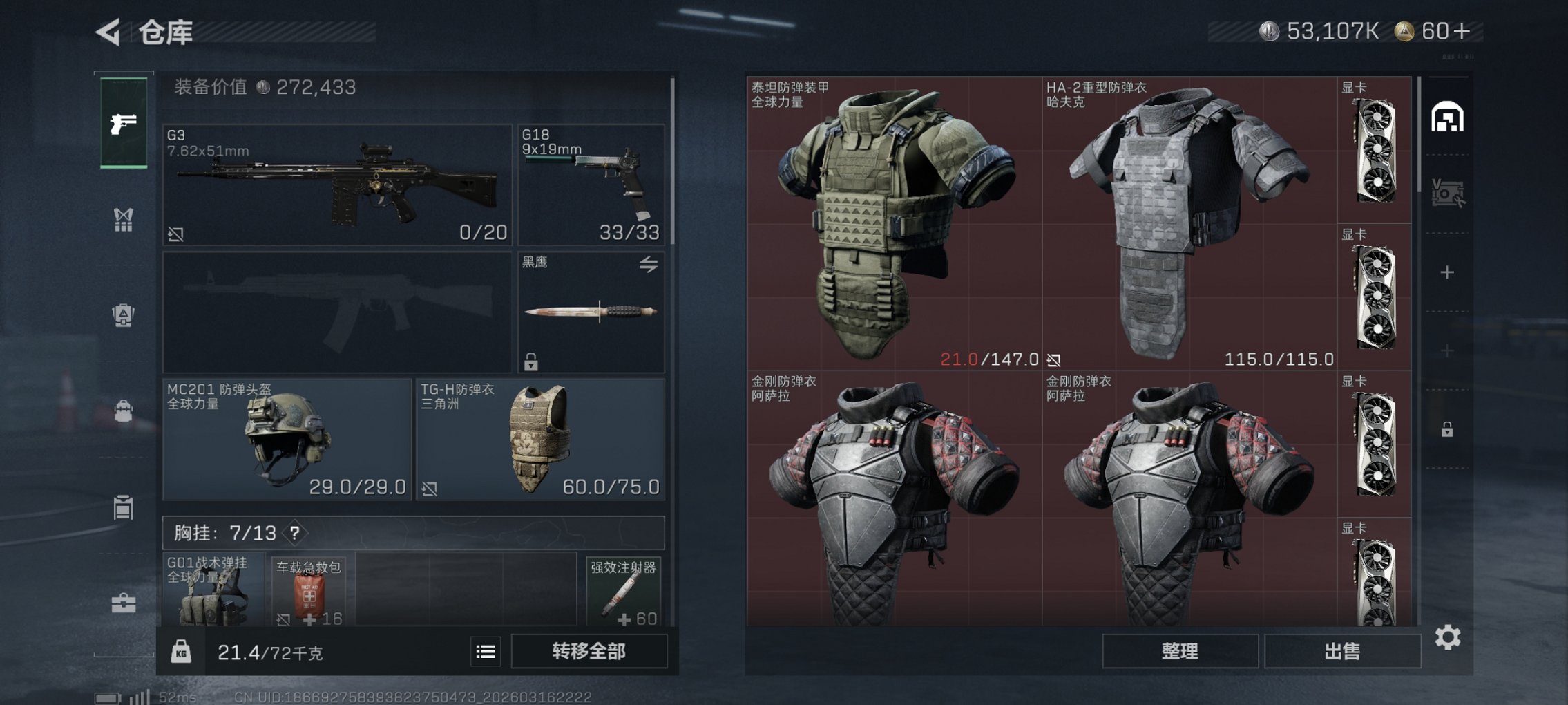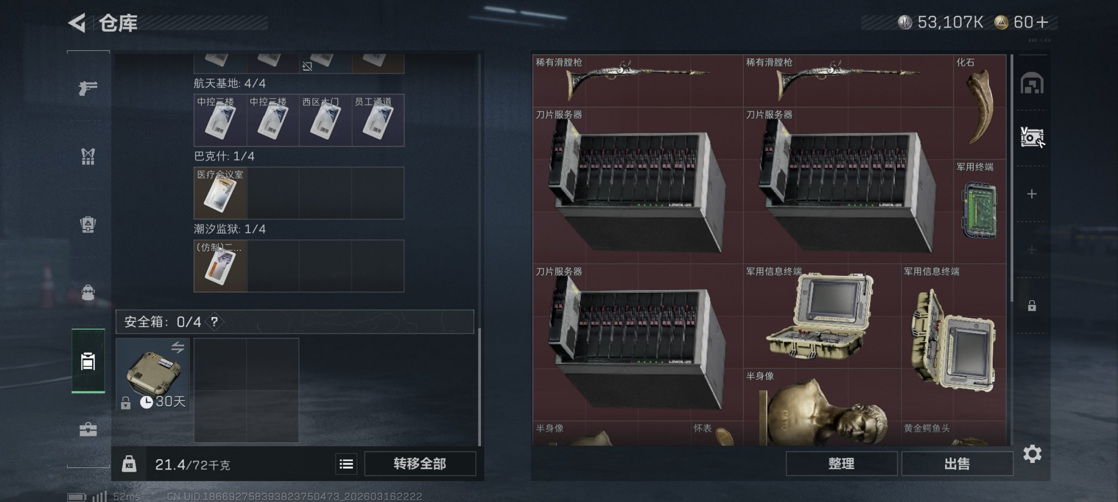 【总资产109M,哈夫币53,107K,行动等级:53,仓库等级:4级,训练中