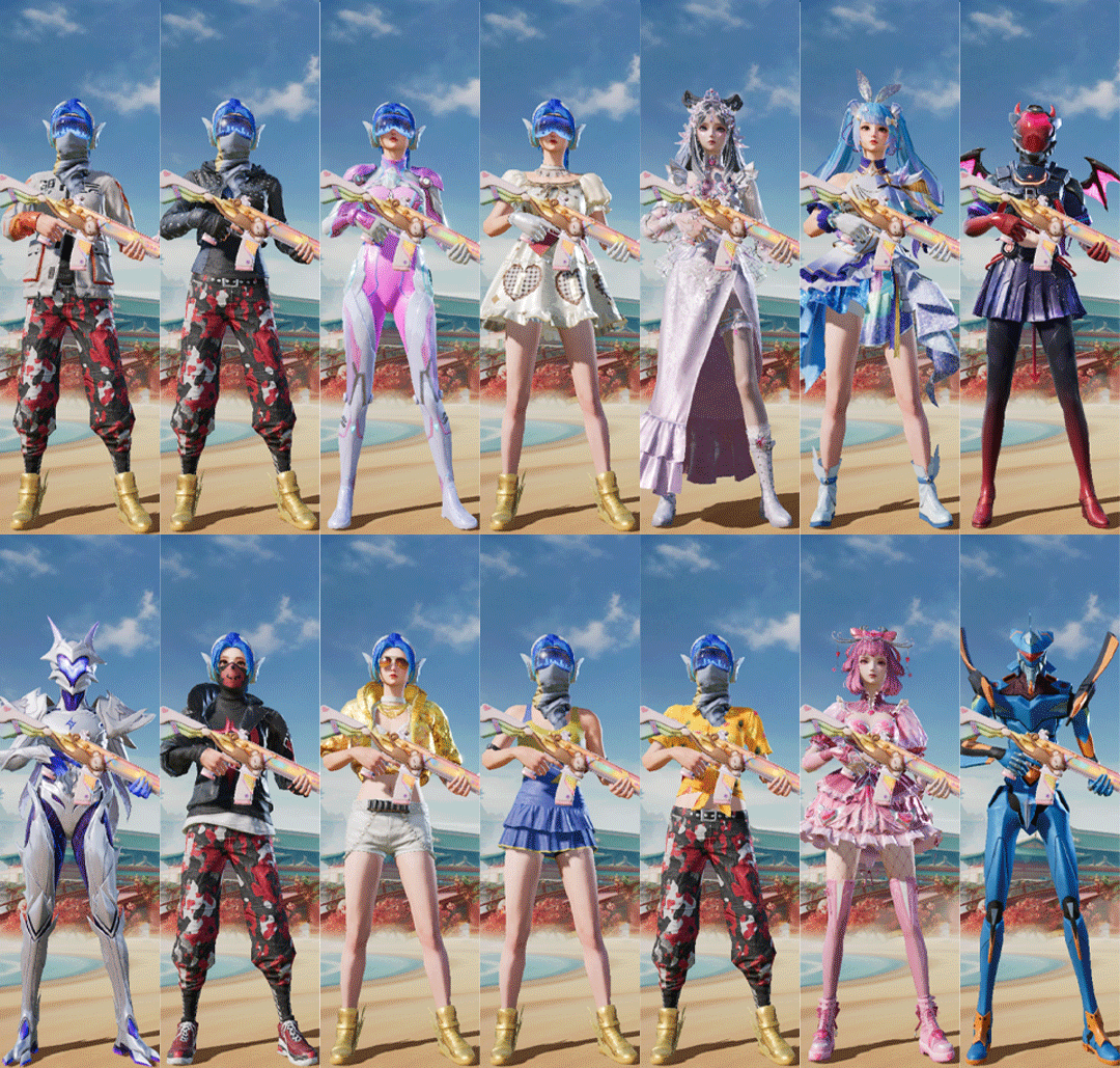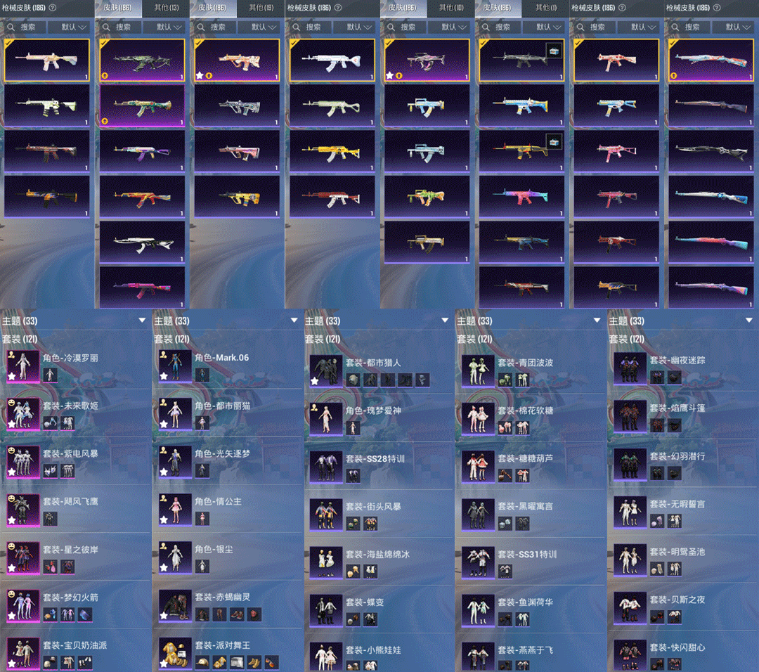 特效枪7:AKM-幽焰骑士/3级,AKS-74U-信仰神谕/7级,,AUG-暖羊咩咩/5级,,Kar98K-巳巳如意/5级,,AKM-绿萝繁花/5级,,GROZA-镜光银凌/5级,,DP-28-豹影疾电/5级,,