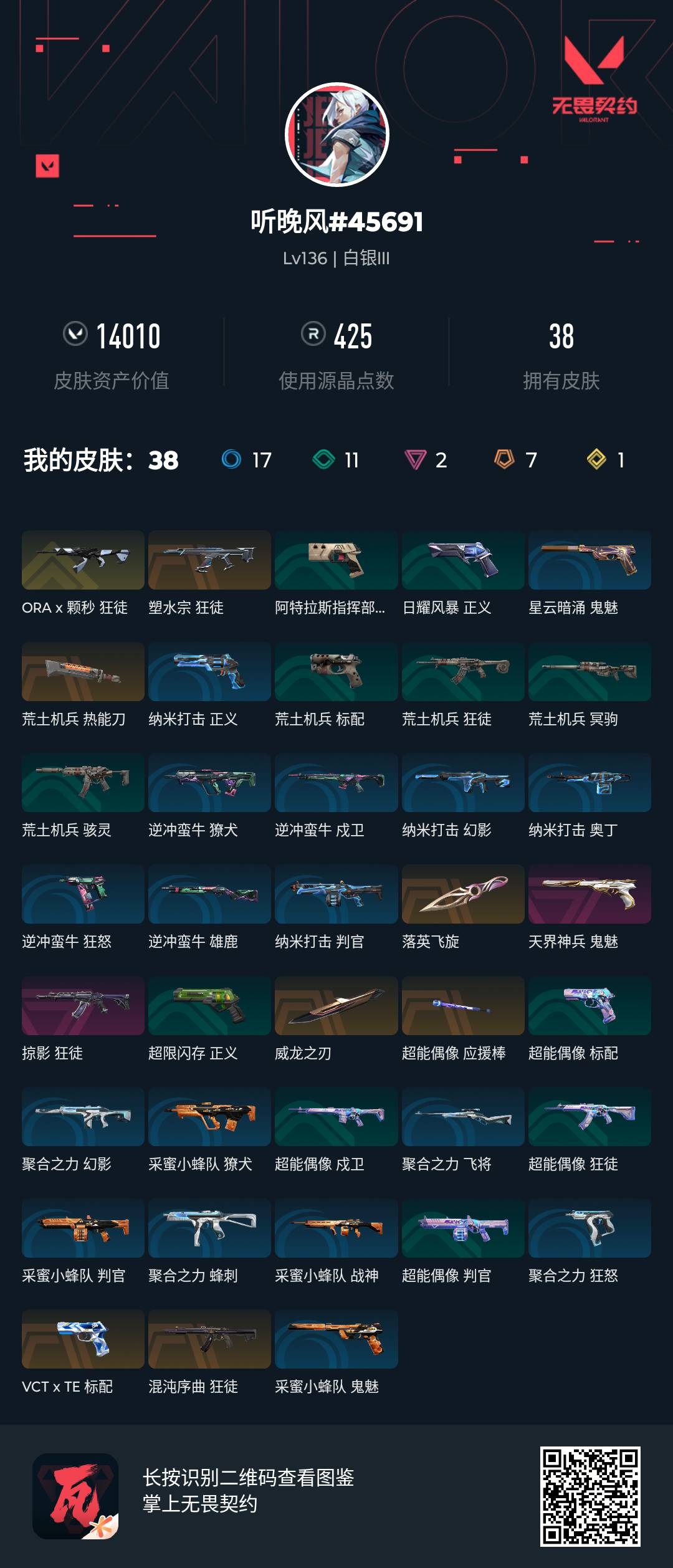 ZMWW580【28英雄 38皮肤 资产14010 枪皮-ORAx颗秒 混沌序曲-狂徒 掠影-狂徒 天界神兵-鬼魅 塑水总-狂徒 刀皮-落英飞旋 威龙之刃】游戏等级:136-段位:白银-皮肤价值14010-已用源晶点数425-英雄28-武器皮肤38 ORAx颗秒-狂徒 塑水宗-狂徒 荒土机兵-热能刀 落英飞旋 天界神兵-鬼魅 掠影-狂徒 威龙之刃 超能偶像-应援棒 VCT-x-TE-标配 混沌序曲-狂徒