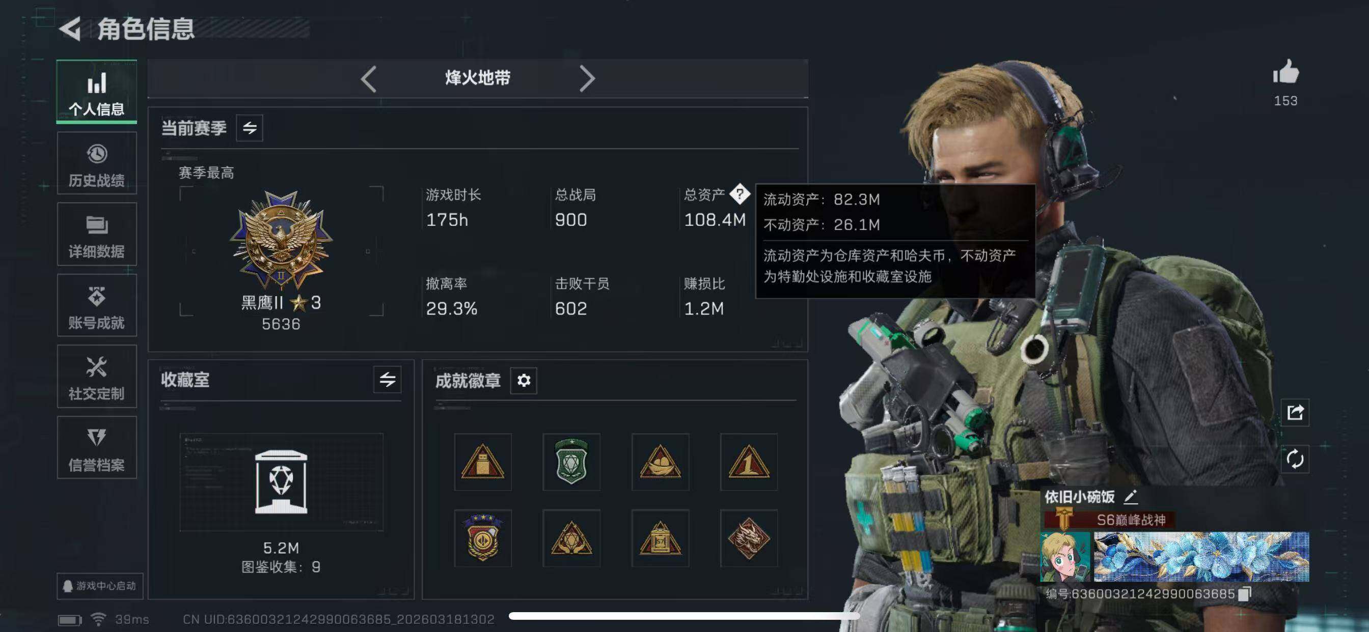 108m总资产-4627k哈夫币-60烽火等级-黑鹰-6战场等级-列兵【干员