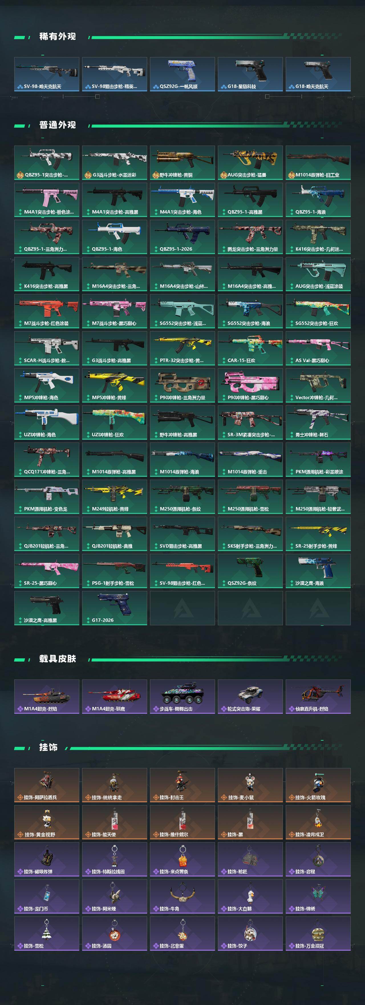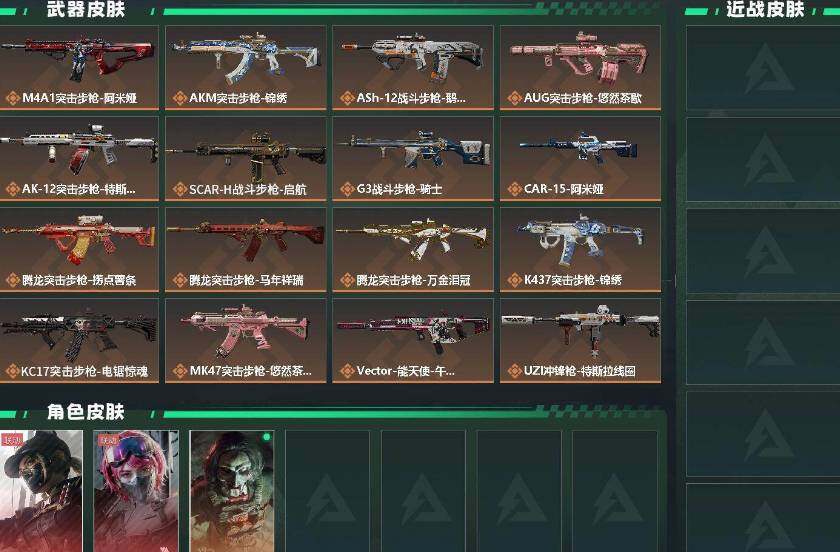 【传说外观】:M4A1突击步枪-阿米娅,AKM突击步枪-锦绣,ASh-12战斗步枪-鹅鸭杀,AUG突击步枪-悠然茶歇,AK-12突击步枪-特斯拉线圈,SCAR-H战斗步枪-启航,G3战斗步枪-骑士,CAR-15突击步枪-阿米娅,腾龙突击步枪-捞点薯条,腾龙突击步枪-马年祥瑞,腾龙突击步枪-万金泪冠,K437突击步枪-锦绣,KC17突击步枪-电锯惊魂,M